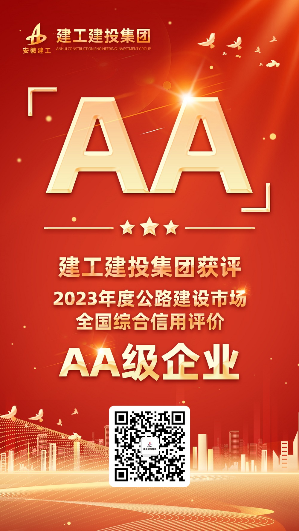 此次信用評價,全國共有946家公路施工企業參評,安徽建工建設投資集團有限公司獲評“2023年度公路建設市場全國綜合信用評價”最高級別AA級企業,充分體現了建工建投在行業內的高水準信用水平和綜合實力,也為企業更好地參與未來市場競爭、做強業務提供了更加有利的條件。