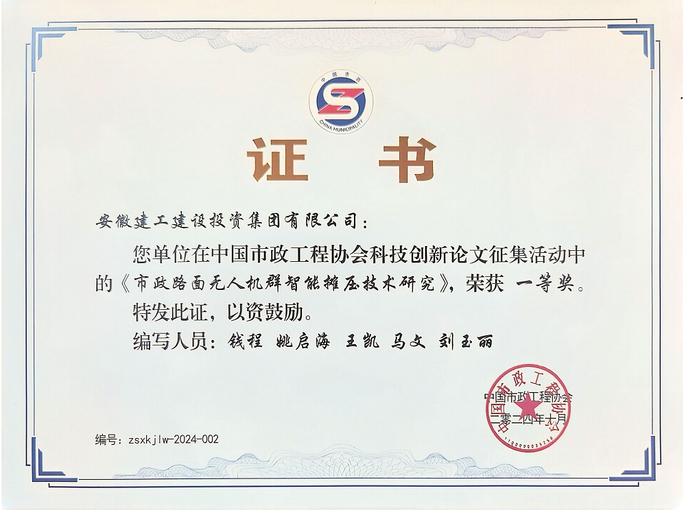 由建工建投集團主申報的濱湖科學城花園大道(徽州大道-包河大道)建設工程,包公大道(護城路-龍興大道)道路工程2個項目榮獲2024年度市政工程最高質量水平評價,建工建投集團創新成果《市政路面無人機群智能攤壓技術研究》在中國市政工程協會科技創新論文征集活動中榮獲一等獎。