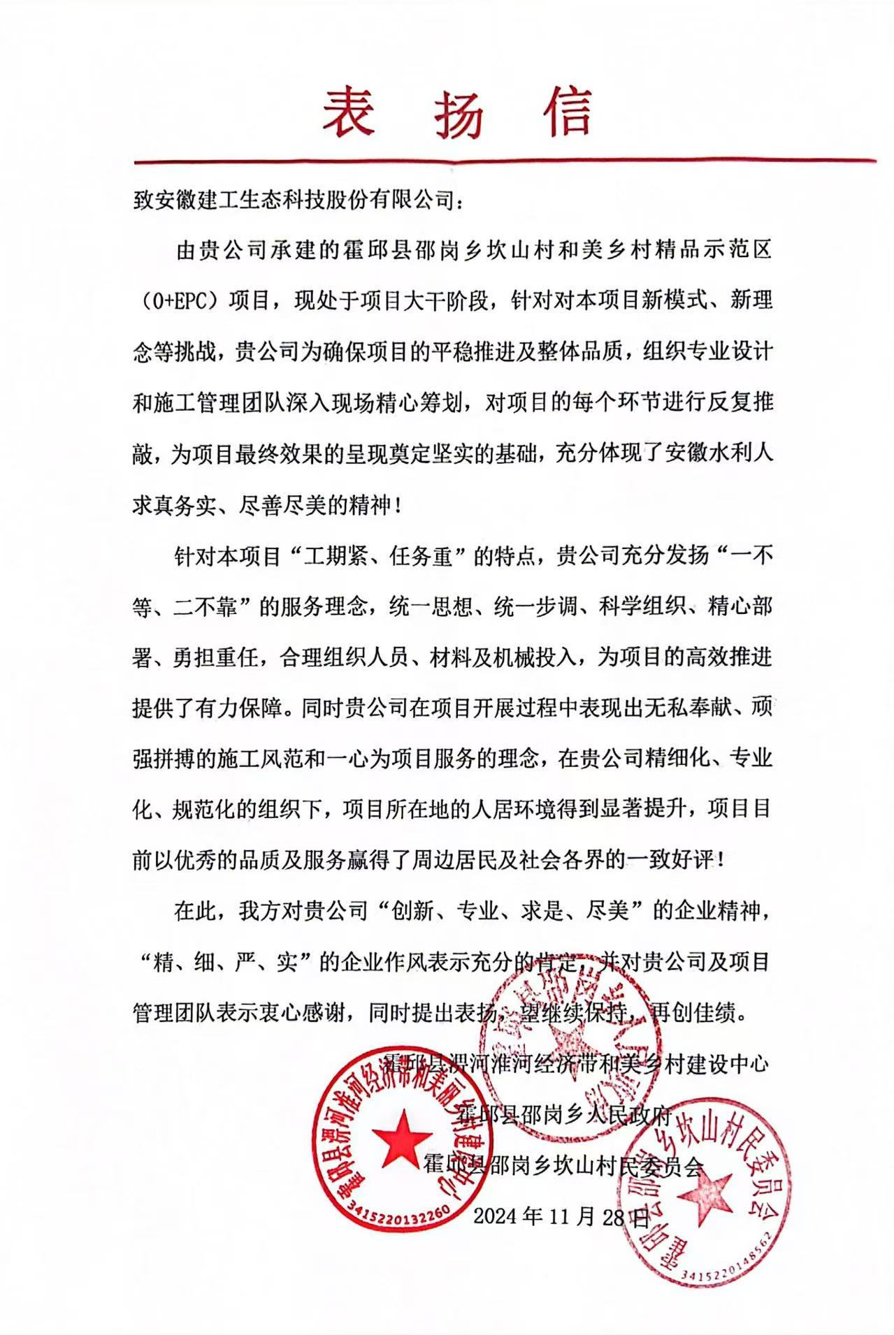 11月28日,安徽水利霍邱縣邵崗鄉坎山村和美鄉村精品示范村(O+EPC)項目獲霍邱縣邵崗鄉人民政府等多家單位來信表揚。