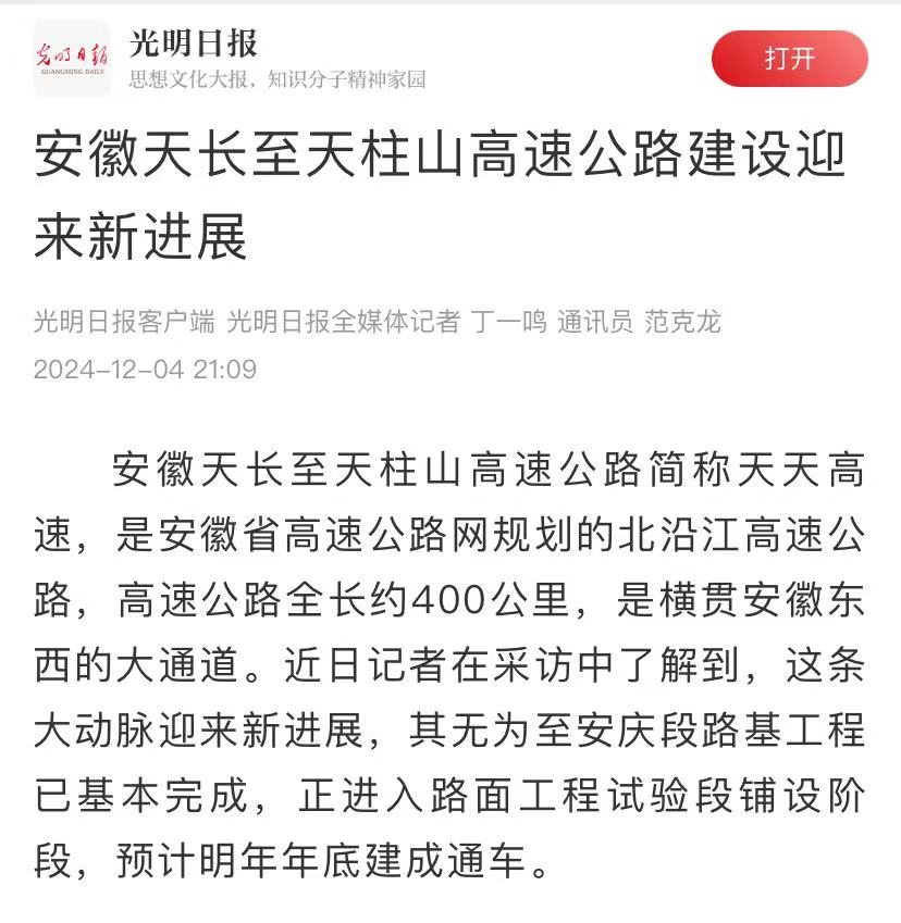近日,安徽水利天長(zhǎng)至天柱山高速公路無為至安慶段路基工程已基本完成,正進(jìn)入路面工程試驗(yàn)段鋪設(shè)階段,預(yù)計(jì)明年年底將建成通車,受到光明日?qǐng)?bào)、安徽日?qǐng)?bào)、中安在線、大皖新聞等主流媒體關(guān)注報(bào)道。