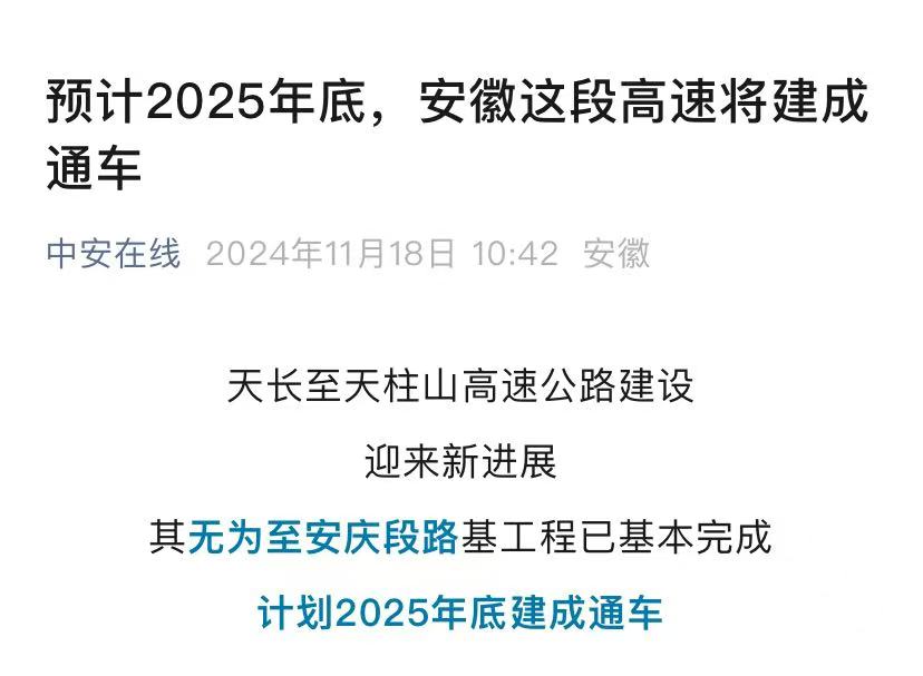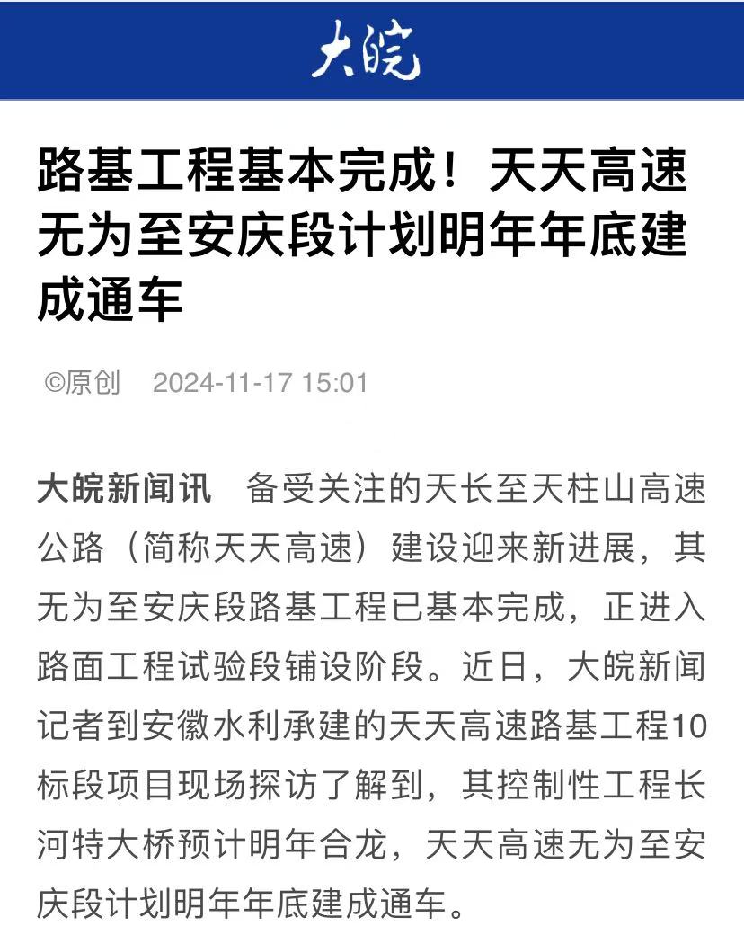 天天高速無為至安慶段項(xiàng)目辦總工王博介紹,目前天天高速無為至安慶段全線路基工程完成90%,橋梁工程完成80%,隧道工程完成75%,路面單位已經(jīng)進(jìn)場(chǎng),即將開始路面試驗(yàn)段鋪設(shè),計(jì)劃2025年底建成通車。“項(xiàng)目建成后,將進(jìn)一步完善安徽沿江高速路網(wǎng),加強(qiáng)安慶、銅陵、蕪湖、馬鞍山、滁州等地的橫向連接。”