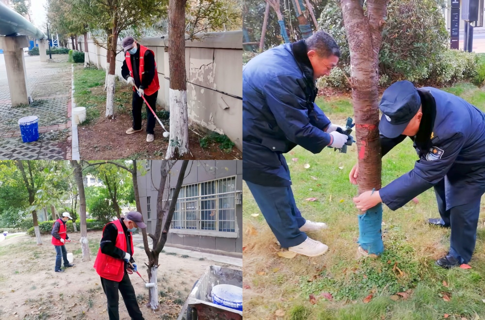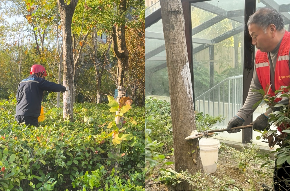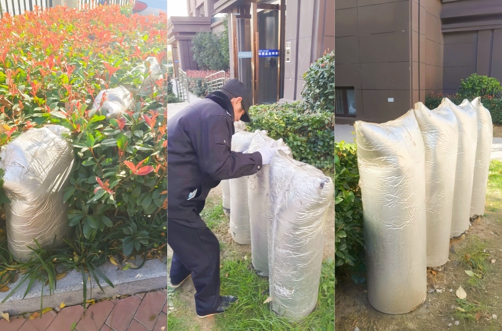 霜凍、寒潮如冷酷殺手,威脅著綠化植物的健康與景觀效果。物業(yè)公司綠化師傅們妙招頻出,在精心落實日常科學養(yǎng)護之余,對新植或不耐寒樹木重點呵護,逐一為樹干刷上潔白防護漆,宛如給樹木穿上“防護服”;部分嬌弱植株則裹上防寒布,變身冬日“暖寶寶”,靜靜守護,只待來年春歸時,重煥滿園蔥郁。