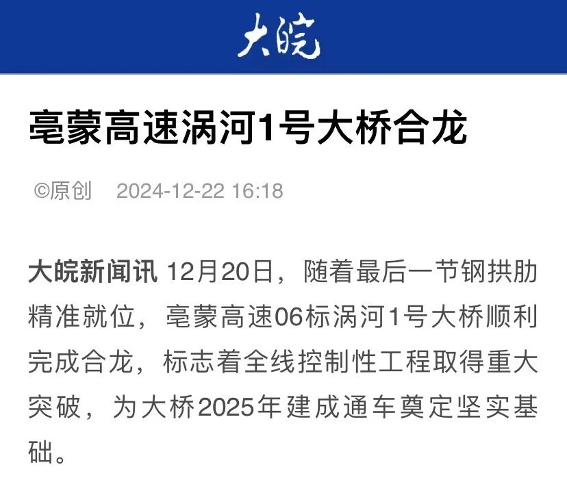 12月20日,隨著最后一節鋼拱肋精準就位,安徽水利亳蒙高速06標渦河1號大橋順利完成合龍,受到大皖新聞、亳州市交通運輸局官微等關注報道。