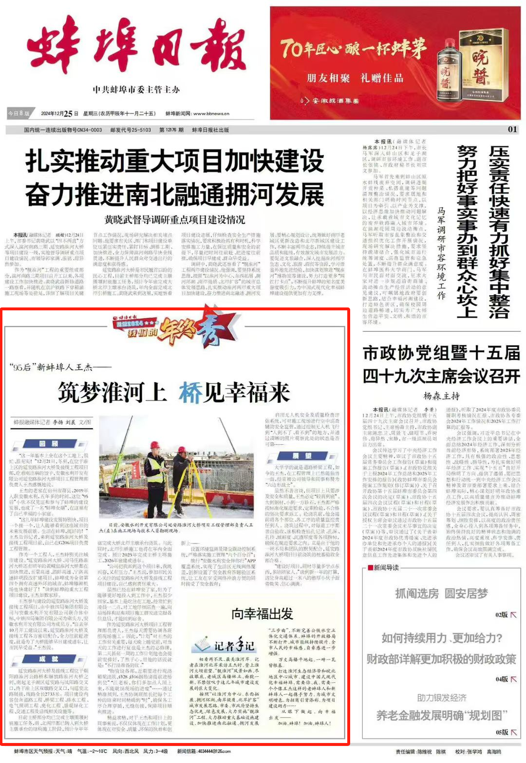 近日,蚌埠日報頭版專題報道安徽水利延安路淮河大橋項目員工王杰扎根基層、以青春之姿勇挑重擔的奮斗故事。