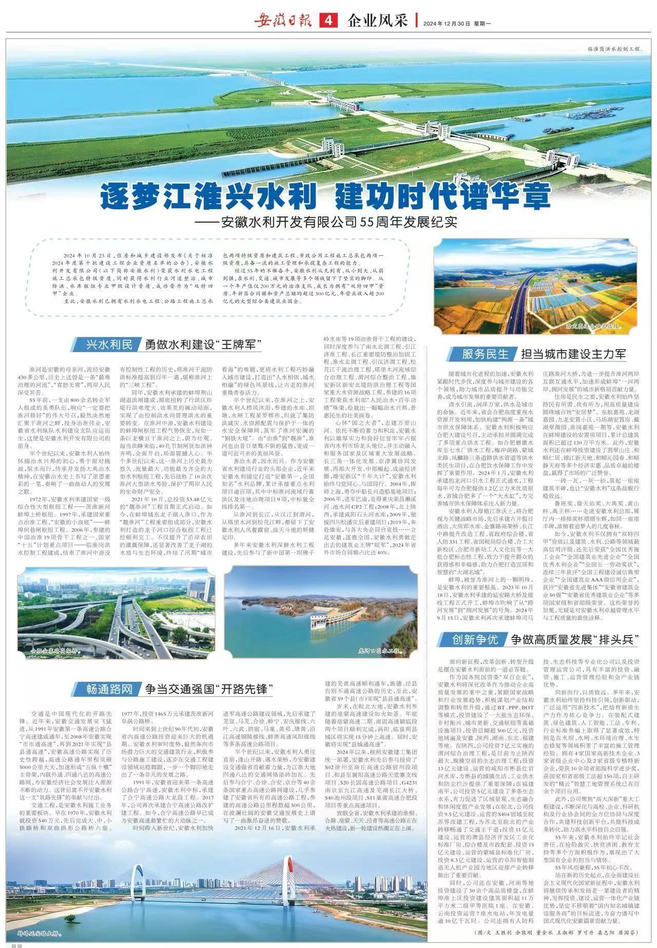 12月30日,是安徽水利開發(fā)有限公司五十五歲生日。安徽日?qǐng)?bào)以《逐夢(mèng)江淮興水利 建功時(shí)代譜華章——安徽水利開發(fā)有限公司55周年發(fā)展紀(jì)實(shí)》為題,專欄報(bào)道安徽水利五十五年發(fā)展歷程及取得的成績(jī)。全文如下: