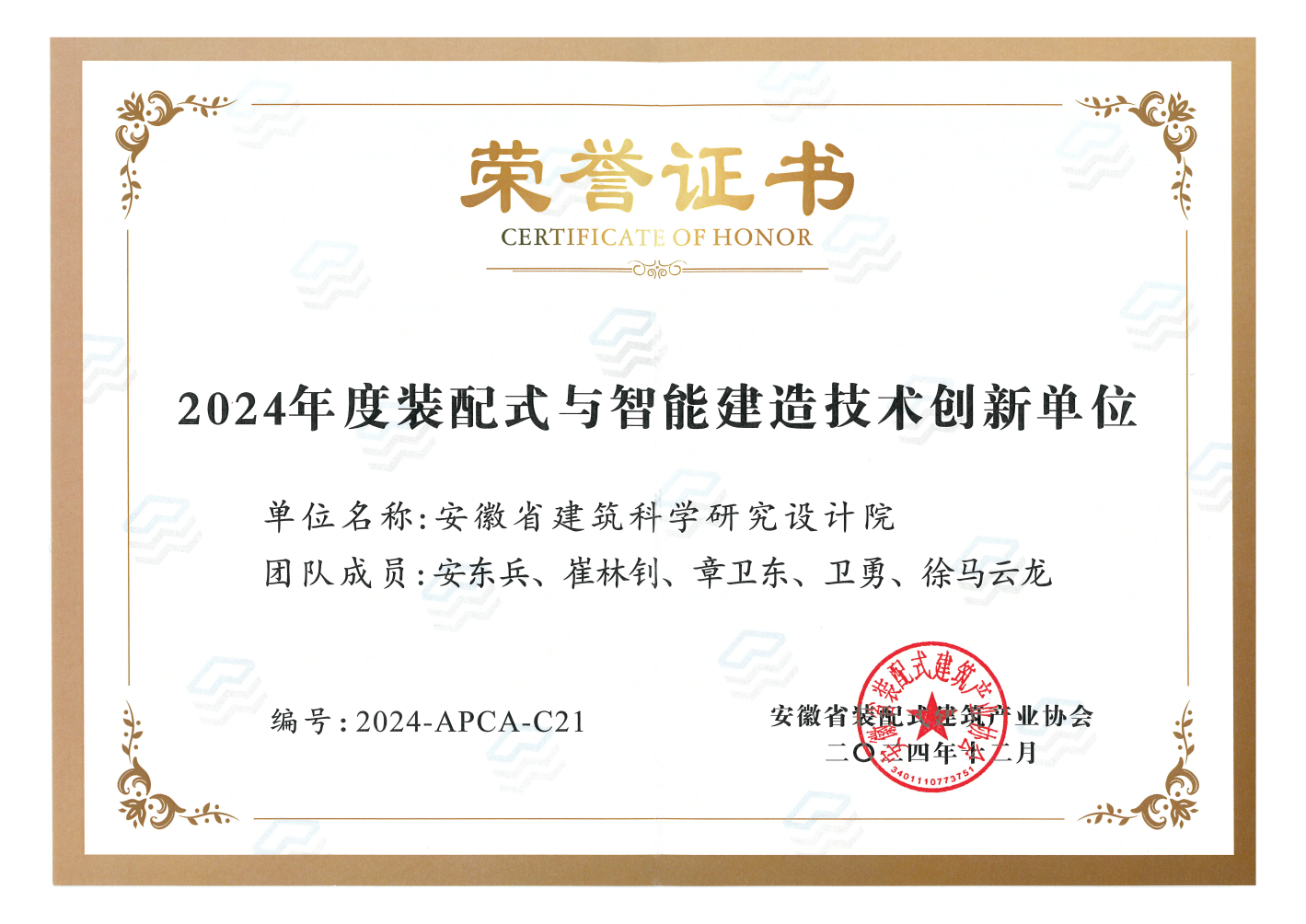 12月28日,安徽省裝配式建筑產(chǎn)業(yè)協(xié)會(huì)一屆一次會(huì)員大會(huì)(理事會(huì))暨技術(shù)交流會(huì)議在合肥召開(kāi),安徽建科榮獲2024年度“裝配式與智能建造技術(shù)創(chuàng)新單位”,樊敏正高工榮獲“建筑技術(shù)推廣先進(jìn)個(gè)人”。