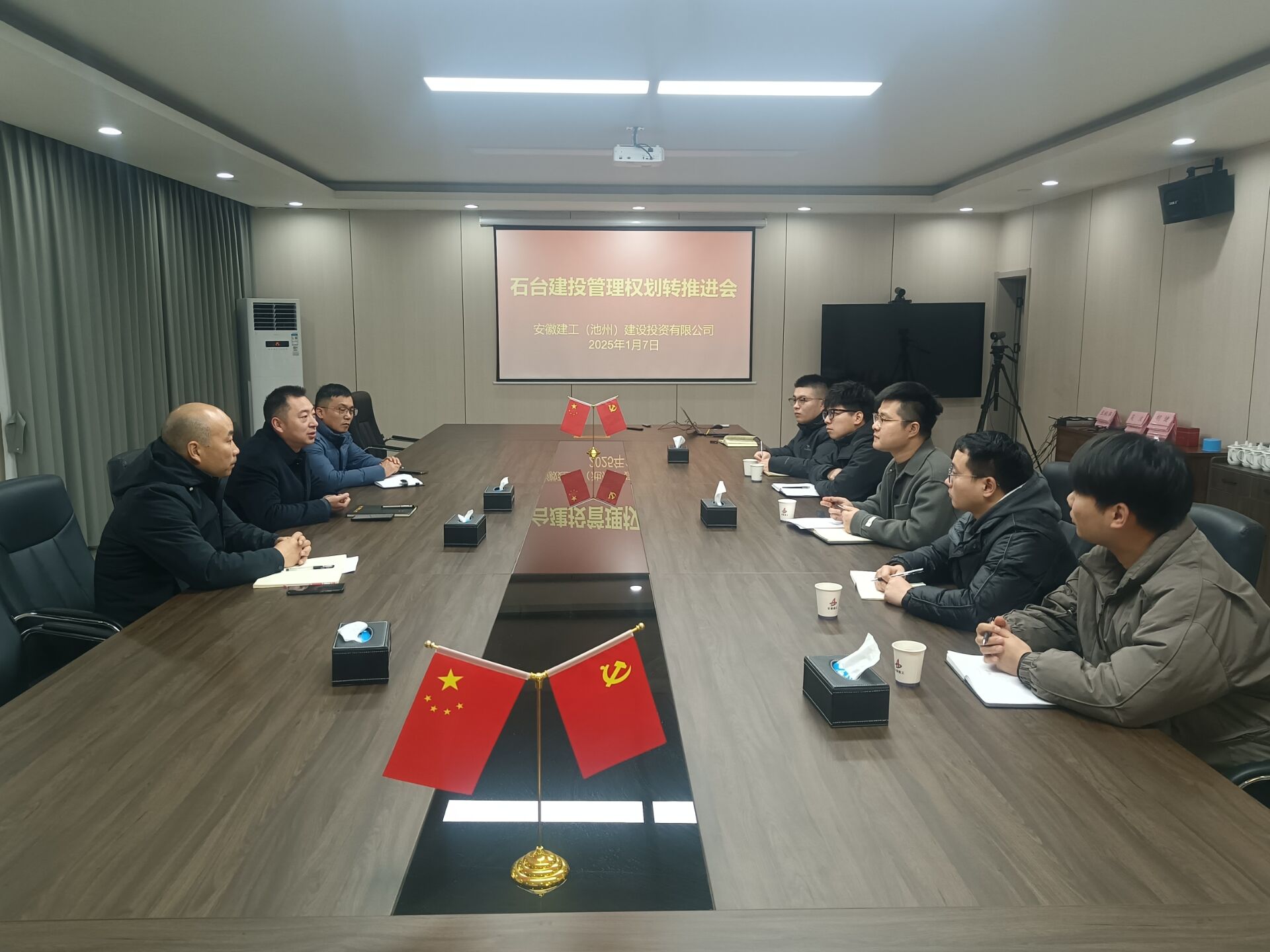 1月7日,池州建投在6樓會(huì)議室召開(kāi)安徽建工石臺(tái)建投管理權(quán)劃轉(zhuǎn)至池州建投推進(jìn)會(huì),池州建投黨委書(shū)記、董事長(zhǎng)、總經(jīng)理王秋華主持會(huì)議,領(lǐng)導(dǎo)班子成員及石臺(tái)建投相關(guān)管理人員參加會(huì)議。