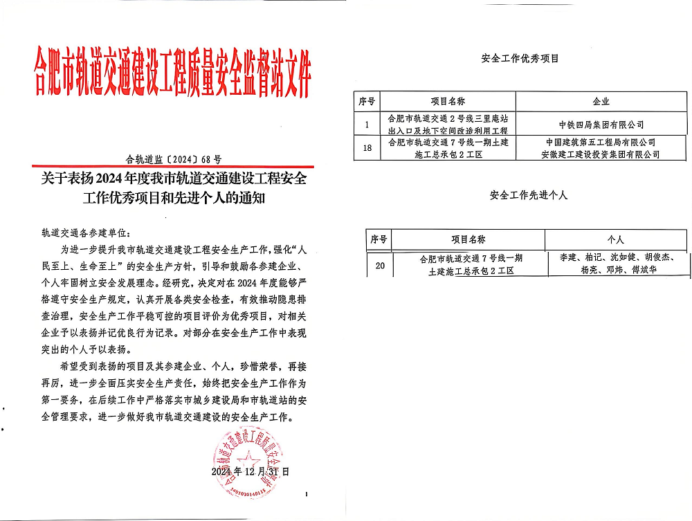 近日,建工建投集團合肥市軌道交通建設工程質量安全監督站發來《關于表揚2024年度我市軌道交通建設工程安全工作優秀項目和先進個人的通知》,建工建投集團合肥市軌道交通7號線一期土建施工總承包2工區項目榮獲“安全工作優秀項目”稱號,鄧煒、傅斌華榮獲“安全工作先進個人”稱號。