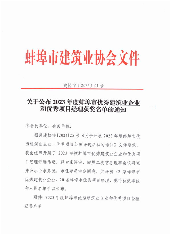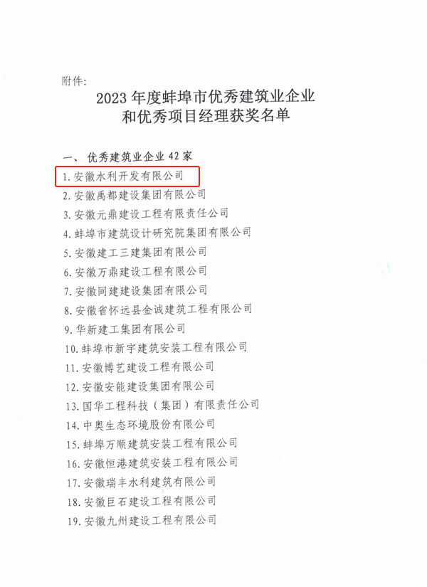 近日,蚌埠市建筑業協會專家評審委員會公布評選結果,安徽水利及所屬安徽建工生態科技股份有限公司獲評2023年度“蚌埠市優秀建筑企業”,安徽水利員工喬玉偉、夏松松、王大祥、朱鵬程、張瑞、李凱、王相狀、余濤、楊金花、徐健、胡廣超、樂永芬、孫云利等13人榮獲“蚌埠市優秀項目經理”稱號。