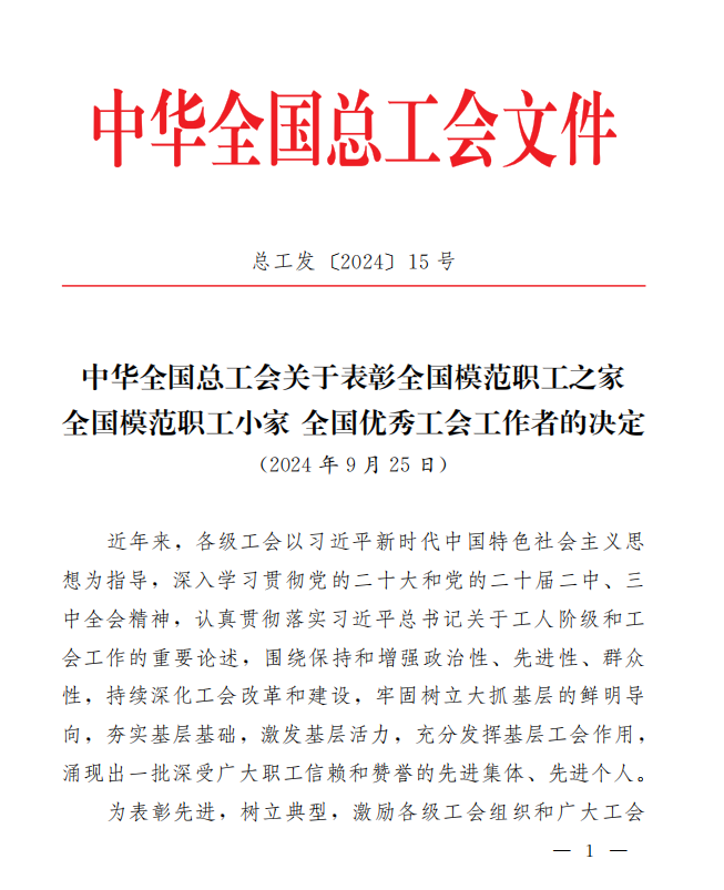 “全國模范職工之家”是全國工會系統表彰先進集體的最高榮譽,由中華全國總工會設立,是對基層工會工作的最高褒獎和肯定。