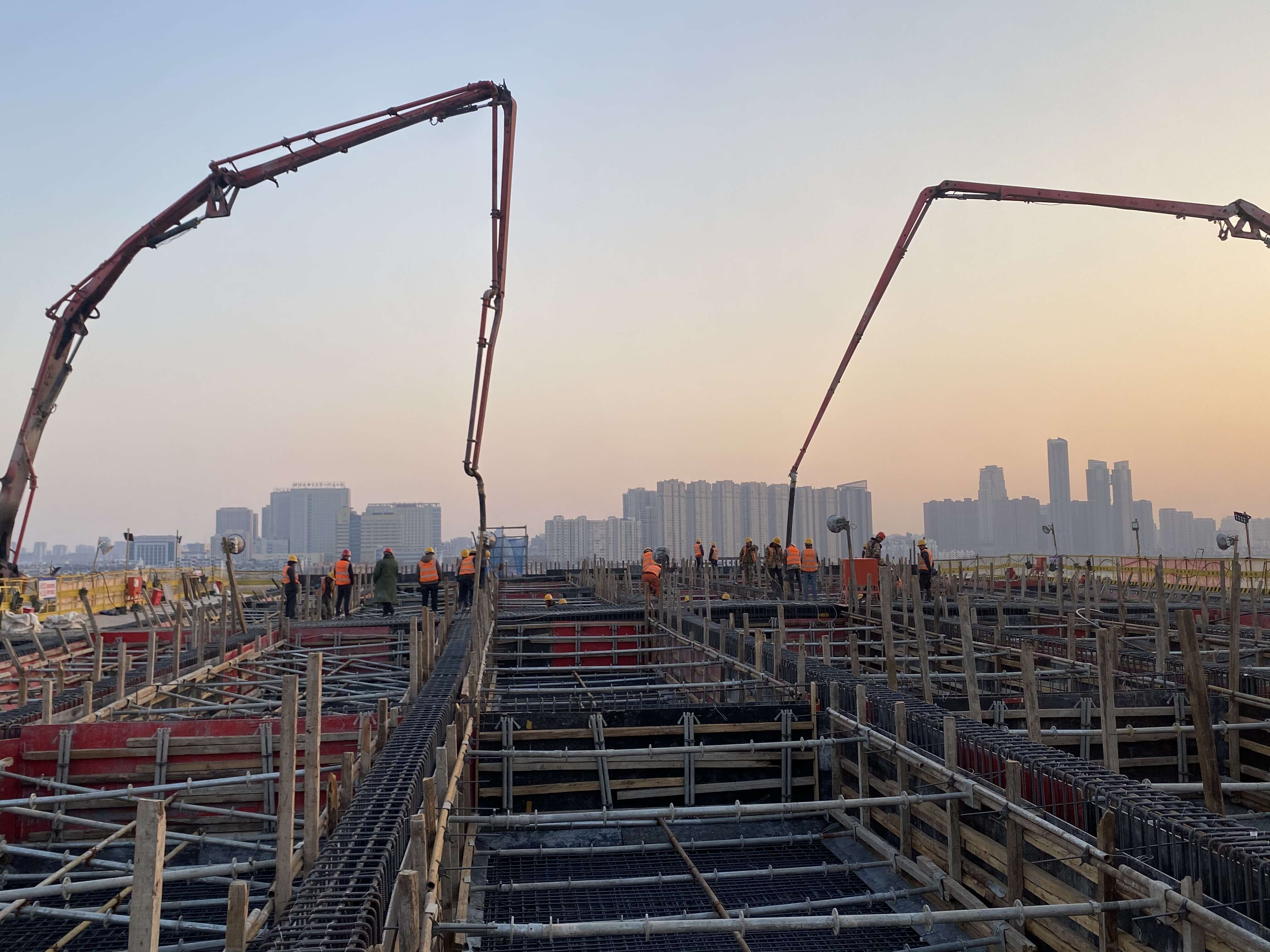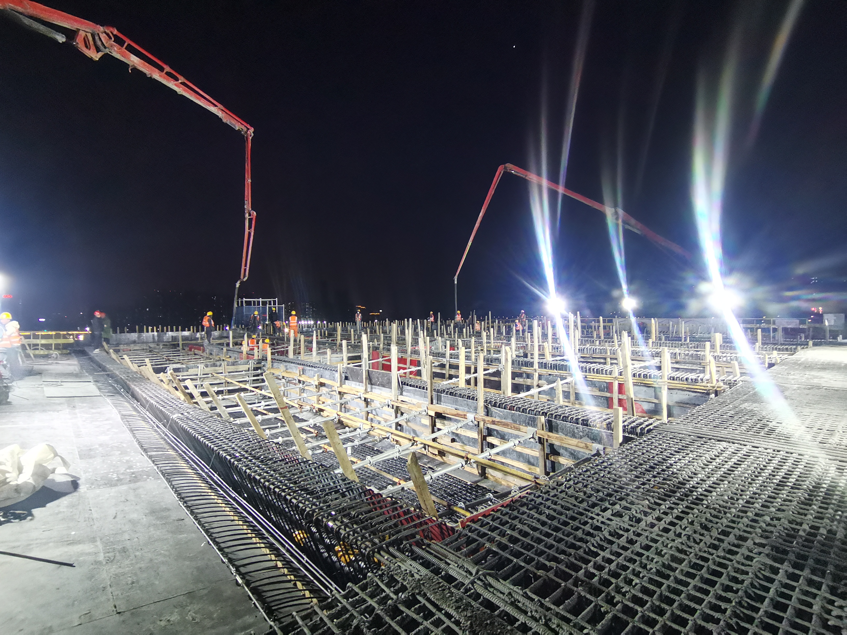 為確保此次大方量混凝土澆筑順利進行,項目部制定了詳細的施工方案,多次召開交流會和交底會,對人員組織、機械和材料準備、施工安全、混凝土質量控制以及后勤保障等各個方面進行了周密的安排,確保對澆筑過程的精確控制。在澆筑過程中,通過“白+黑”輪班模式,技術人員全程監督,實時監控施工進度與質量,確了保施工連續性。在全體人員的密切配合下,施工作業一氣呵成,成功完成了澆筑任務。澆筑完成后,項目采用覆蓋塑料薄膜蒸汽養護法進行了后續混凝土養護,確?;炷翉姸确€步增長。