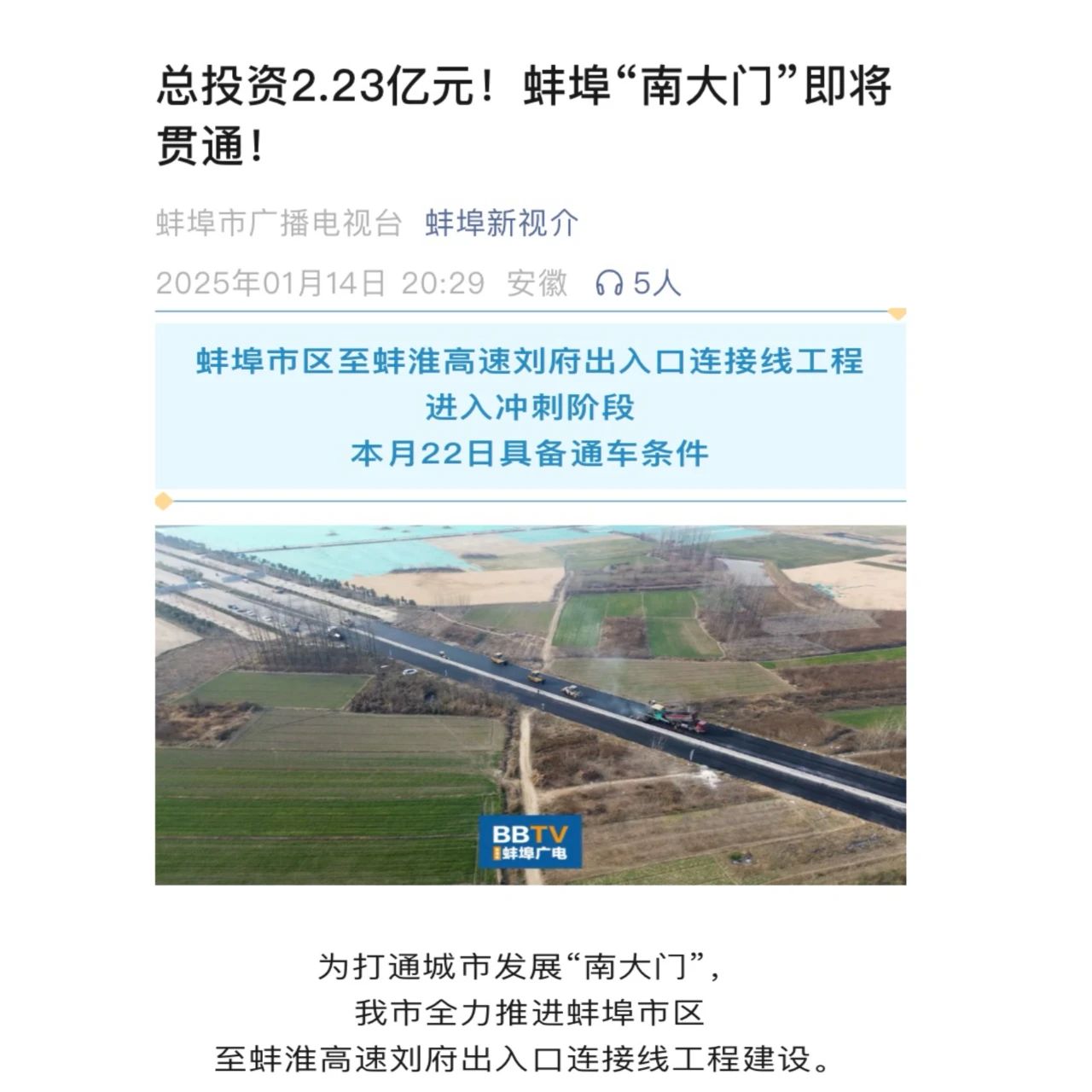 1月14日上午,安徽水利Y011蚌淮高速項目部全線路面工程圓滿完工,預(yù)計本月22日基本具備通車條件,受到蚌埠日報紙媒、蚌埠市廣播電視臺等主流媒體關(guān)注報道。