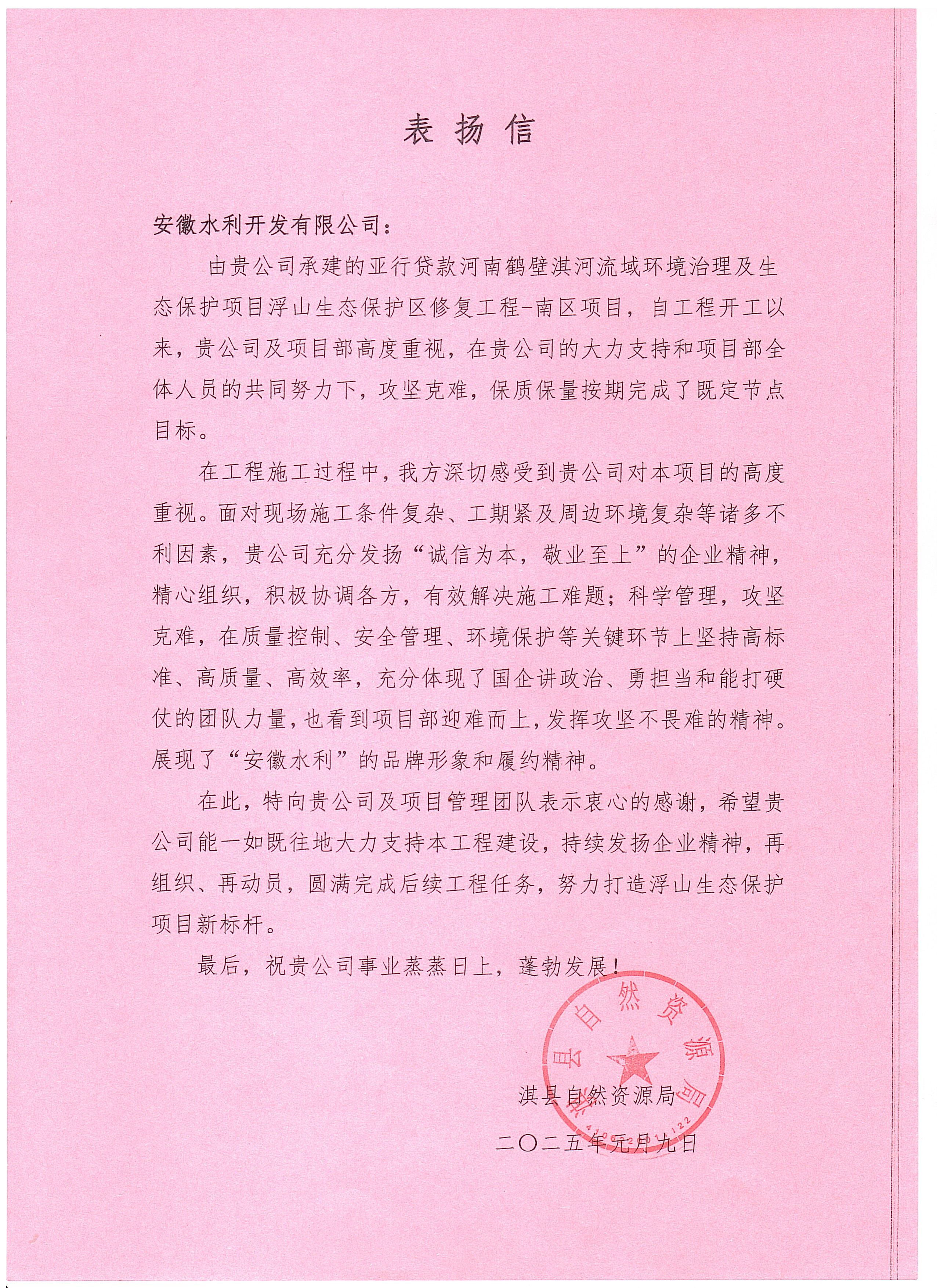 近日,安徽水利河南鶴壁淇河流域環(huán)境治理及生態(tài)保護(hù)項(xiàng)目(浮山生態(tài)保護(hù)區(qū)修復(fù)工程-南區(qū))收到鶴壁市淇縣自然資源局來(lái)信表?yè)P(yáng)。