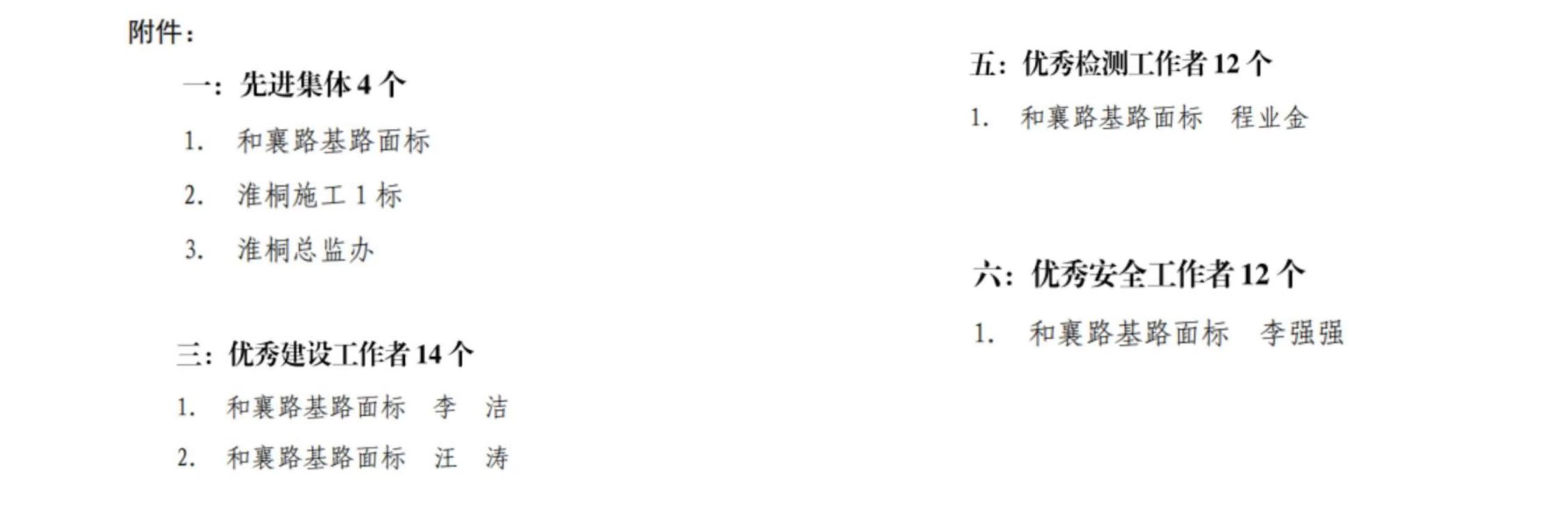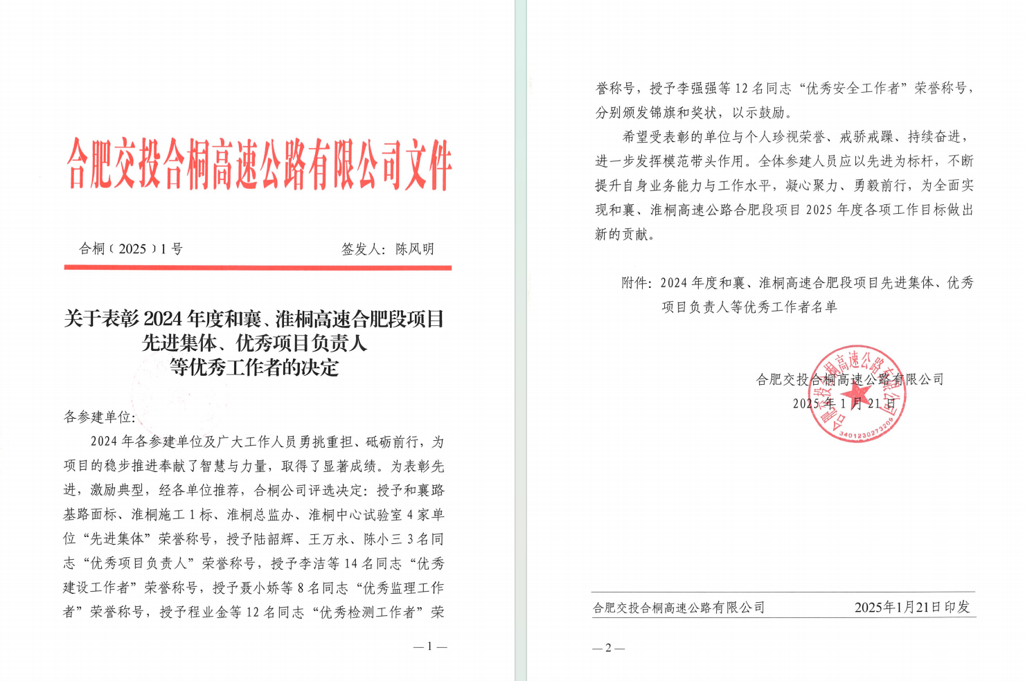 近日,由合肥交投合桐高速公路有限公司舉辦的和襄、淮桐高速合肥段2024年度工作總結大會暨表彰大會上,合桐公司對和襄高速項目的成績和表現給予了高度認可。建工路港和襄高速項目在四季度暨年度參建單位綜合考評中以90.37分的佳績榮獲第一名,獲得“先進集體”稱號。李潔、汪濤兩位同志被授予“優秀建設工作者”稱號;程業金同志被授予“優秀檢測工作者”稱號;李強強同志被授予“優秀安全工作者”稱號。