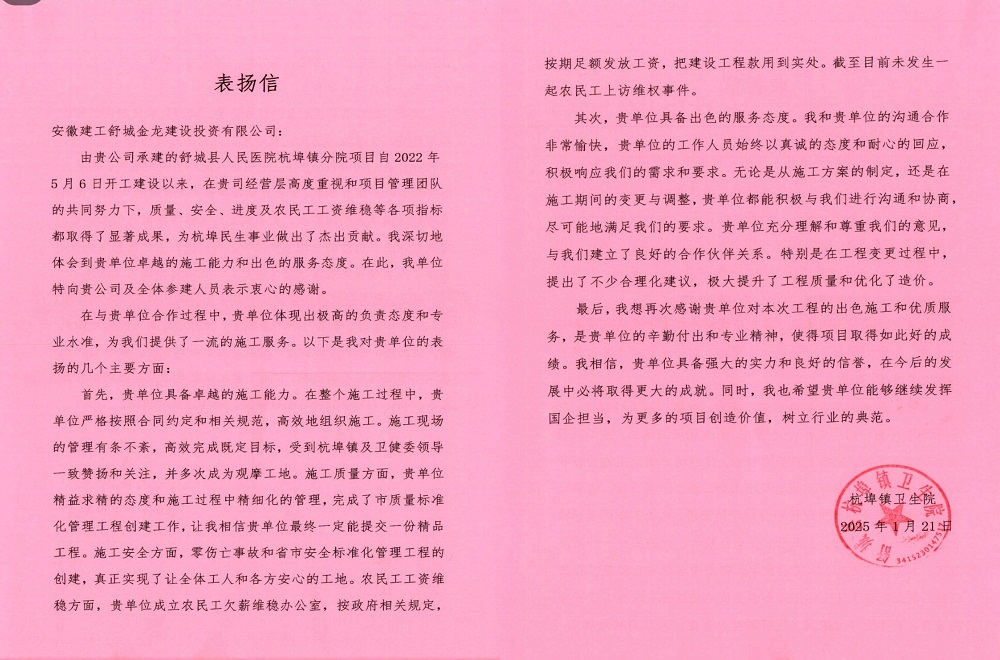 舒城縣人民醫(yī)院杭埠鎮(zhèn)分院項目收獲業(yè)主表揚信。