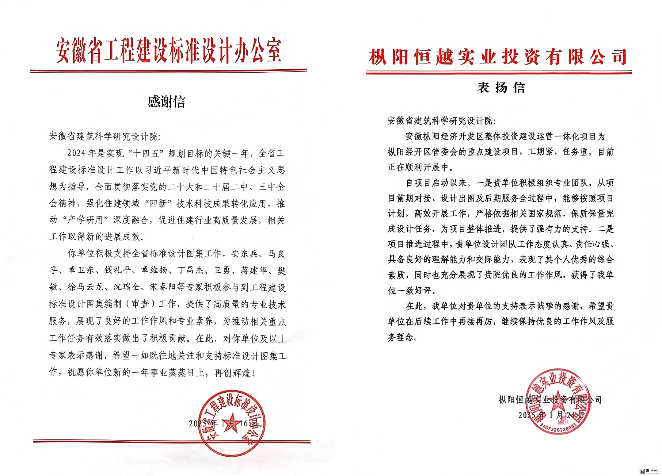 近日,在安徽省工程建設標準設計辦公室的感謝信中,對安徽建科安東兵、馬良浮、章衛東、錢禮平、章維揚、丁昌杰、衛勇、蔣建華、樊敏、徐馬云龍、沈瑞全、宋春陽等專家在工程建設標準設計圖集編制(審查)工作中展現出的高質量專業技術服務,良好工作作風和專業素養等給予充分肯定和高度贊揚。在樅陽恒越實業投資有限公司發來的表揚信中,對安徽建科在安徽樅陽經濟開發區整體投資建設運營一體化項目中高效開展工作、保質保量完成設計任務等表示誠摯的感謝。