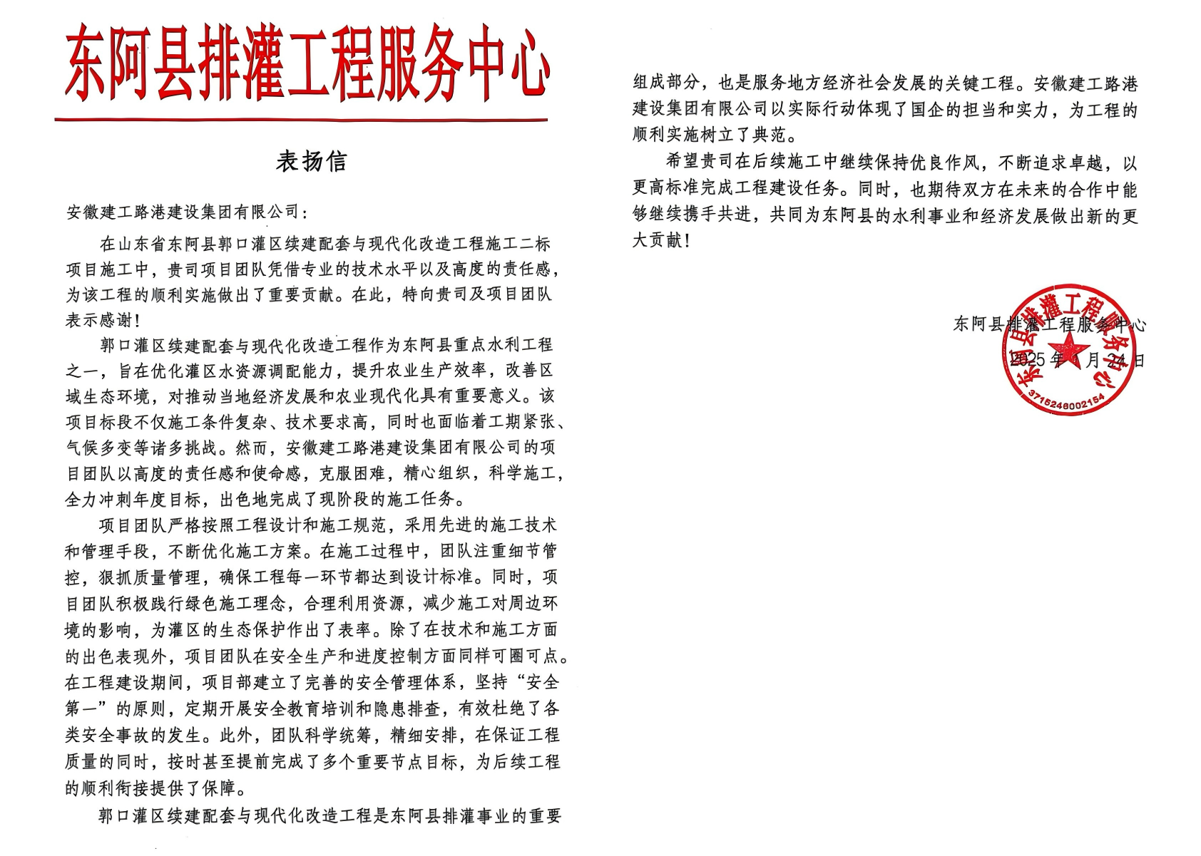1月24日,建工路港山東東阿水利項目榮獲東阿縣排灌工程服務中心表揚信。