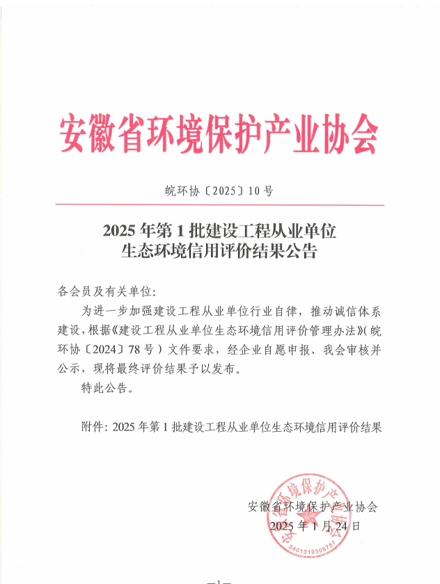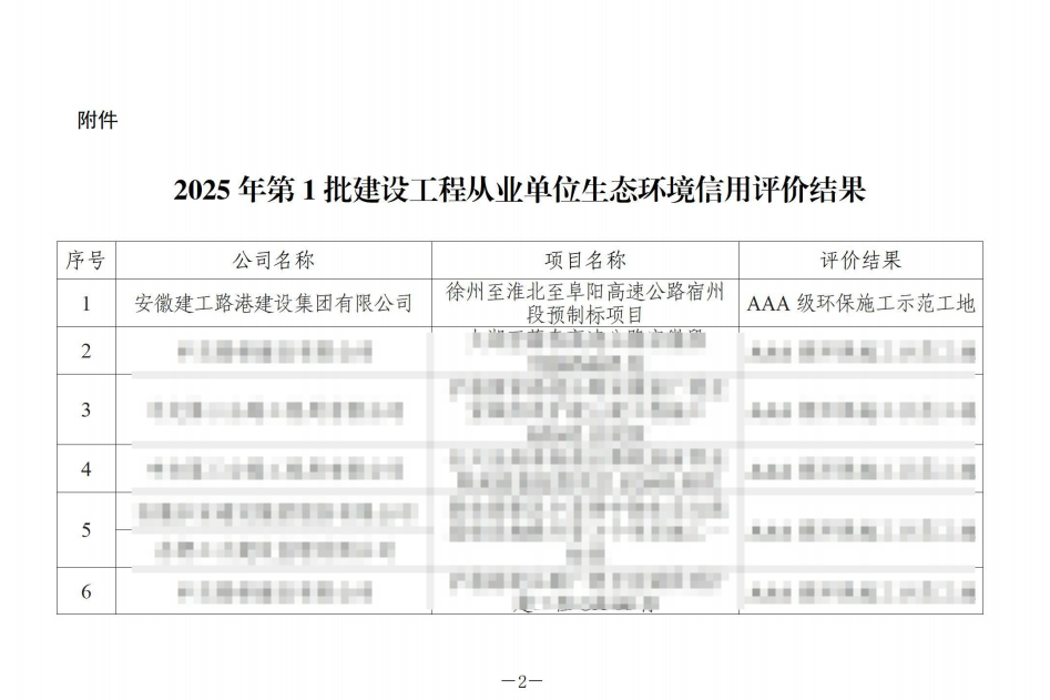 近日,安徽省環境保護產業協會公布了2025年第1批建設工程從業單位生態環境信用評價名單,由建工路港承建的徐州至淮北至阜陽高速公路宿州段預制標項目榮獲“AAA級環保施工示范工地”榮譽稱號。
