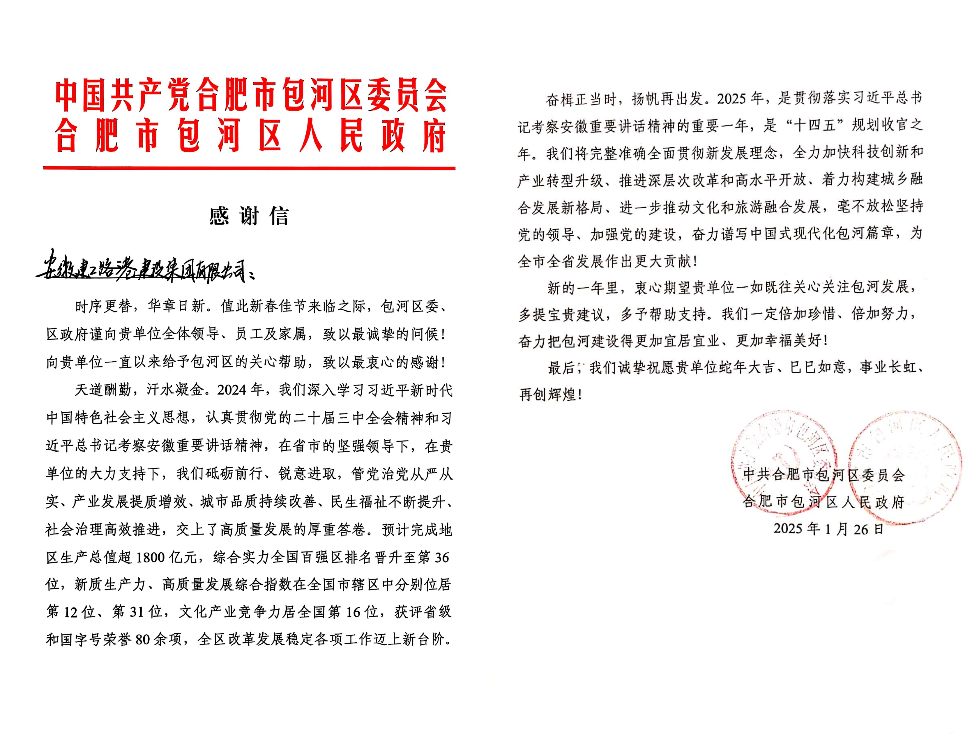 1月26日,建工路港關(guān)麓路建設(shè)工程項(xiàng)目收獲包河區(qū)人民政府感謝信。