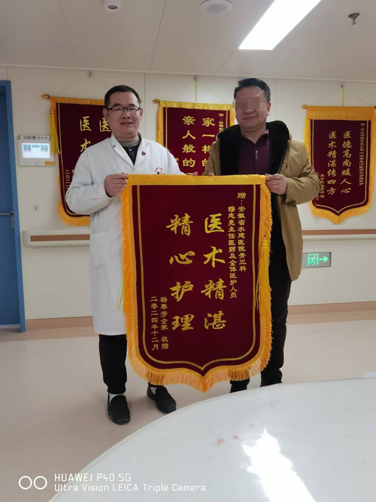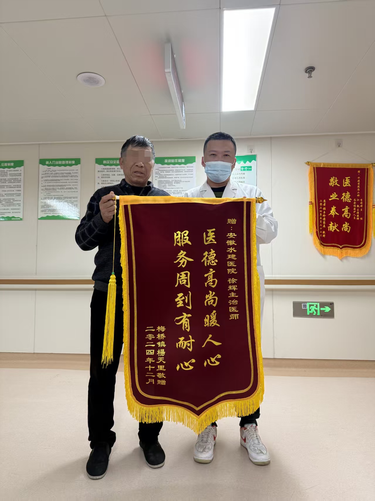 出院時,他特意準備一面錦旗,親手送到徐輝醫生手中,表達對徐醫生的感激之情。