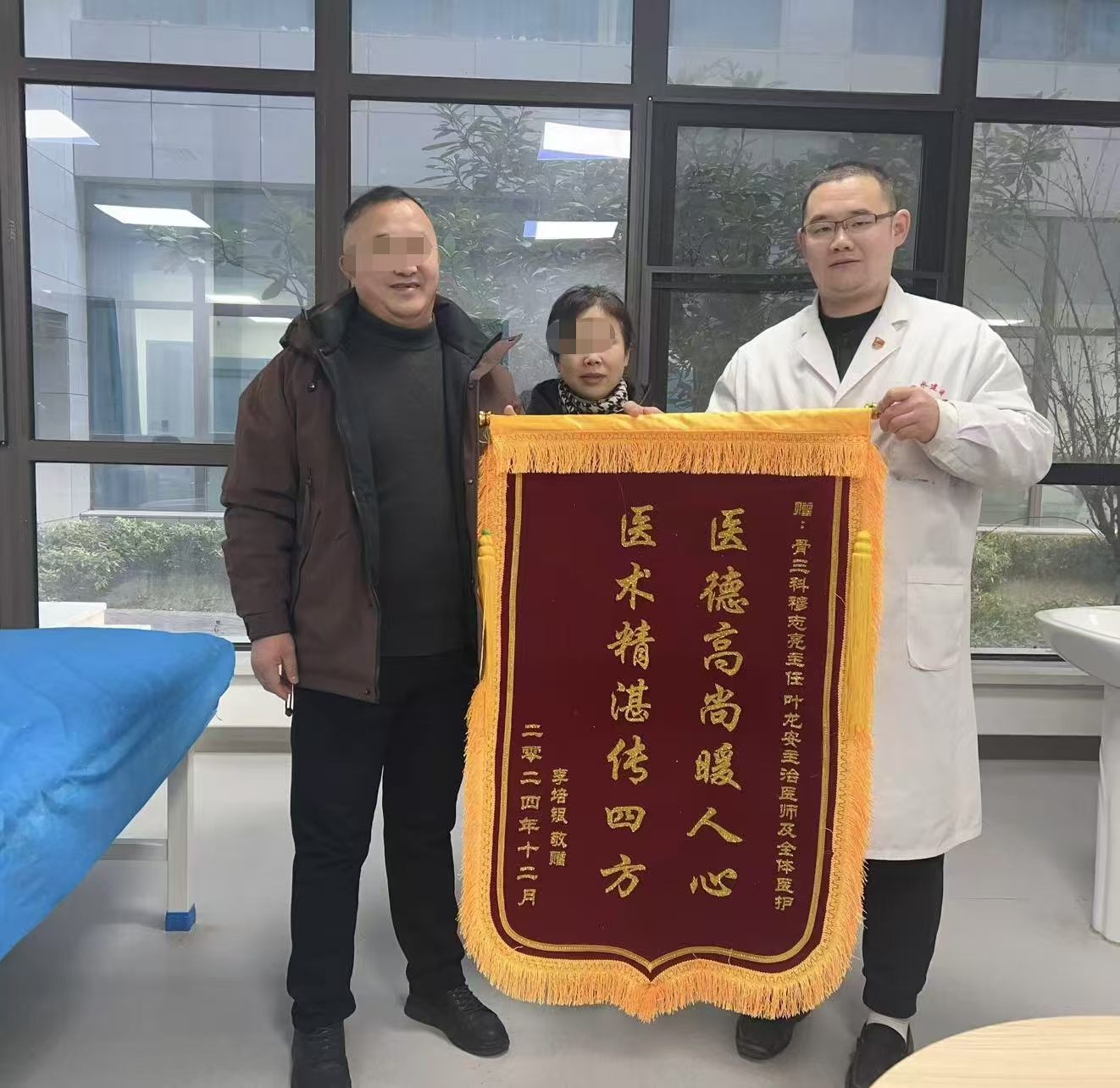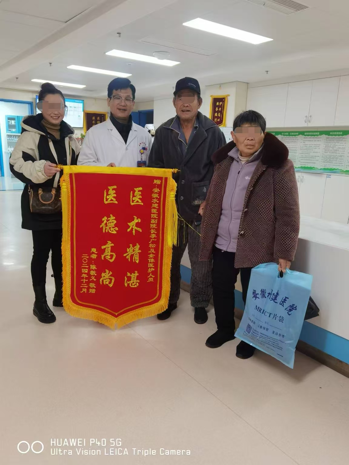 手術后,李先生恢復良好,他滿懷感激,特意攜家人一同送來錦旗,感謝穆主任和葉龍安醫生以及全體醫護人員。