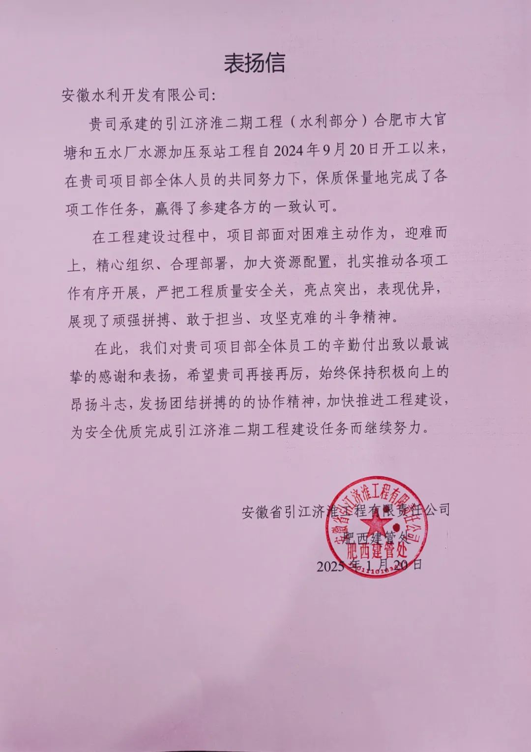 引江濟淮加壓泵站項目收到業(yè)主表揚信,信中指出,自2024年9月20日開工以來,項目部全體人員面對困難主動作為,迎難而上,精心組織、合理部署,加大資源配置,扎實推動各項工作有序開展,嚴把工程質量安全關,亮點突出,表現(xiàn)優(yōu)異,展現(xiàn)了頑強拼搏、敢于擔當、攻堅克難的斗爭精神,贏得了參建各方的一致認可。同時,項目兩位員工榮獲業(yè)主單位2024年勞動競賽“先進個人”稱號。