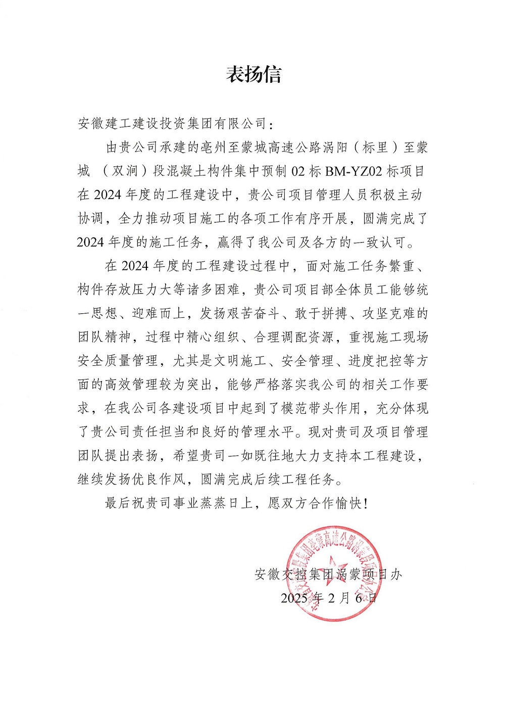 表揚(yáng)信指出,亳蒙預(yù)制02標(biāo)項目在2024年度的工程建設(shè)過程中,面對施工任務(wù)繁重、構(gòu)件存放壓力大等諸多困難,項目部全體員工能夠統(tǒng)一思想、迎難而上,發(fā)揚(yáng)艱苦奮斗、敢于拼搏、攻堅克難的團(tuán)隊精神,過程中精心組織、合理調(diào)配資源,重視施工現(xiàn)場安全質(zhì)量管理,尤其是文明施工、安全管理、進(jìn)度把控等方面的高效管理較為突出,能夠嚴(yán)格落實業(yè)主單位的相關(guān)工作要求,在各建設(shè)項目中起到了模范帶頭作用,項目管理人員積極主動協(xié)調(diào),全力推動項目施工的各項工作有序開展,圓滿完成了2024年度的施工任務(wù),贏得了業(yè)主單位及各方的一致認(rèn)可。