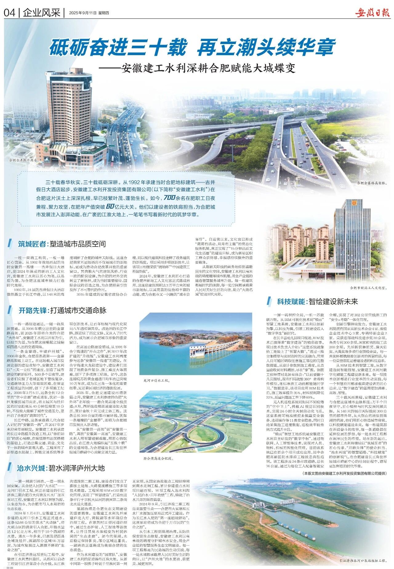 三十載風雨兼程,安徽建工水利與合肥這座城市血脈相連;萬千個日夜堅守,匠心精神與時代發展同頻共振。從148米的城市天際線到300公里的都市外環,從大別山的清泉到巢湖的碧波,他們用匠心鑄造城市脊梁,以科技賦能建設未來。每一棟建筑都在訴說奮斗的故事,每一條道路都在延伸發展的夢想,每一處水利工程都在潤澤民生的希望。站在新的起點,安徽建工水利將繼續以“筑城匠者”的匠心傳承、“開路先鋒”的使命擔當、“治水興城”的智慧韜略、“科技賦能”的創新銳氣,在合肥建設長三角世界級城市群副中心的壯闊征程中,譜寫更加輝煌的時代華章。
