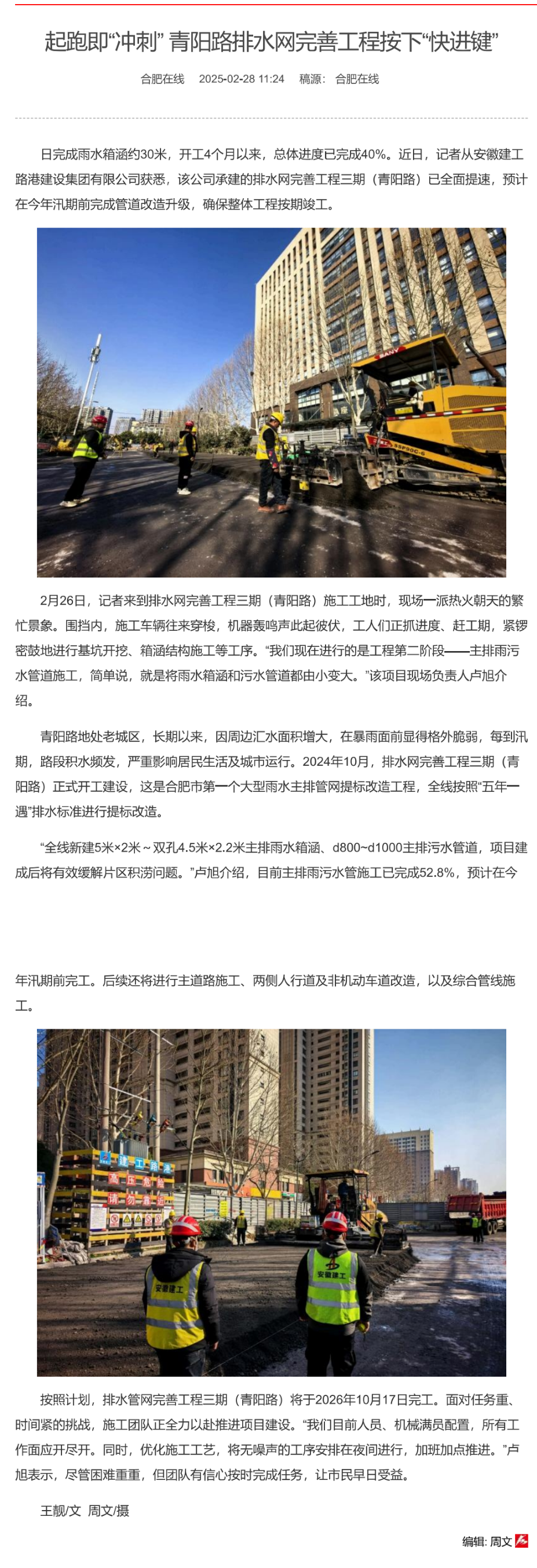 近日,建工路港青陽路排水網完善工程建設再提速,力爭高質量完成任務,讓市民早日受益,合肥日報以《起跑即“沖刺” 青陽路排水網完善工程按下“快進鍵”》為題進行了專題報道。