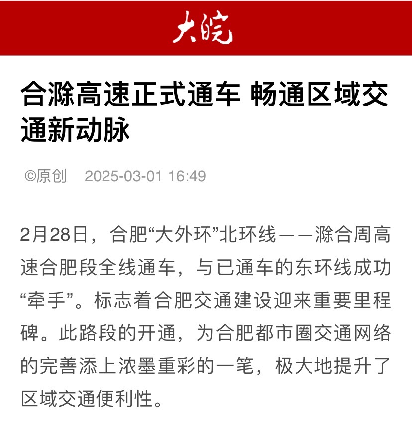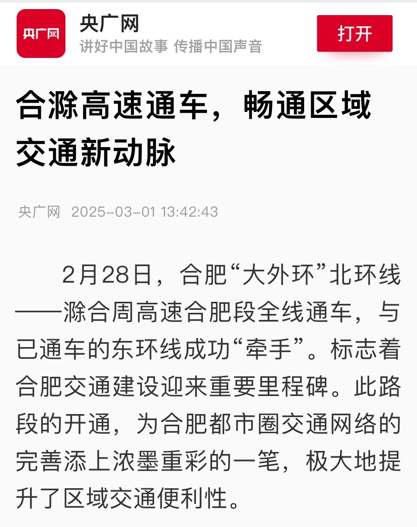 2月28日,建工水利承建的合肥“大外環”北環線——滁合周高速合肥段全線通車,與已通車的東環線成功“牽手”,受到央廣網、大皖新聞等主流媒體關注報道。