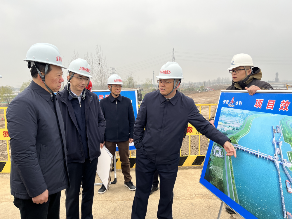 3月5日,安徽省財政廳黨組書記、廳長谷劍鋒一行到建工水利姑溪河當涂閘樞紐工程項目檢查指導。