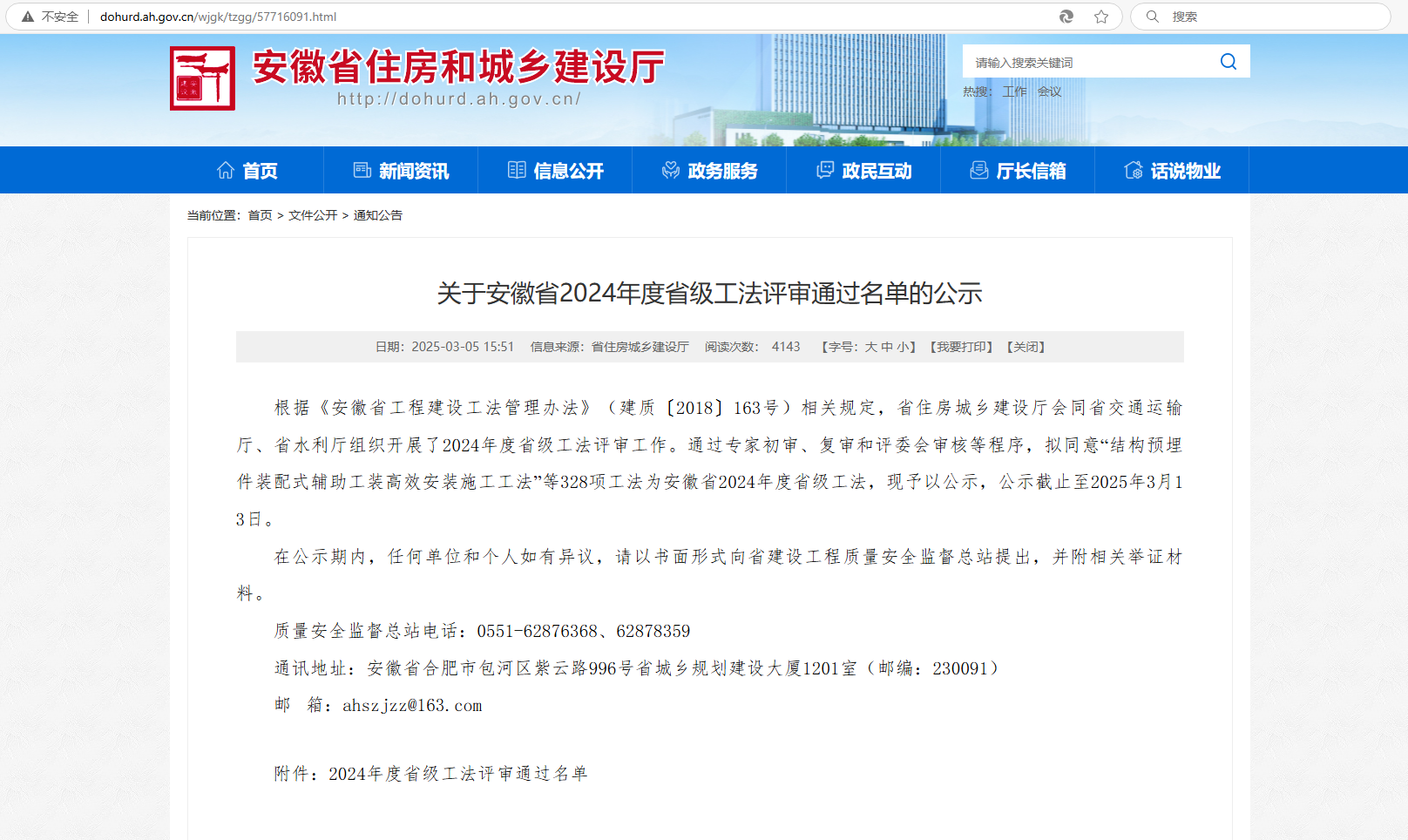 安徽省工程建設工法是全省工程建設領域的重要技術創新成果,以工程為對象,以工藝為核心,運用系統工程原理,把先進技術和科學管理結合起來,經過一定工程實踐形成的綜合配套的施工方法,體現了當前建筑業綠色化、智能化、工業化的發展趨勢。