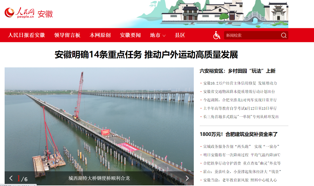 4月8日,建工建投S20長豐至固始高速公路霍邱至皖豫界段工程路基路面02標城西湖特大橋鋼便橋順利合龍貫通。人民網、《市場星報》深入項目一線展開報道,稿件登上人民網安徽頻道首頁。