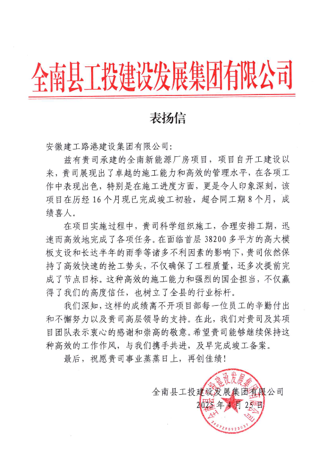 近日,建工路港收到江西省全南縣工投建設(shè)發(fā)展集團(tuán)有限公司發(fā)來(lái)的表?yè)P(yáng)信,信中對(duì)公司在全南縣新能源產(chǎn)業(yè)園標(biāo)準(zhǔn)廠房及配套基礎(chǔ)建設(shè)項(xiàng)目中的出色表現(xiàn)予以高度肯定。