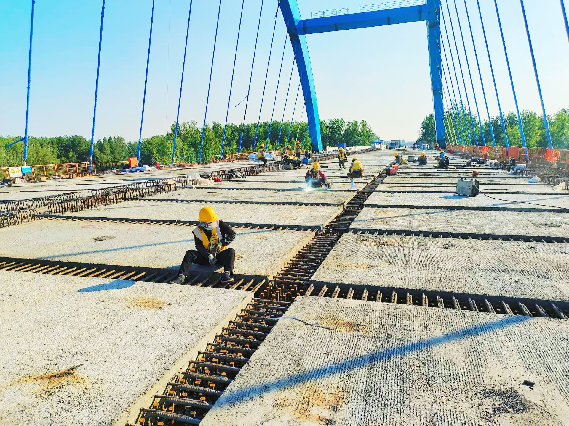 為確保5月底實現大橋全線竣工,20余名作業人員實行24小時全天候輪值施工,同步推進引橋橋面鋪裝、吊桿張拉、主橋橋面板鋪裝、橋面系澆筑以及護欄安裝等多項作業任務。