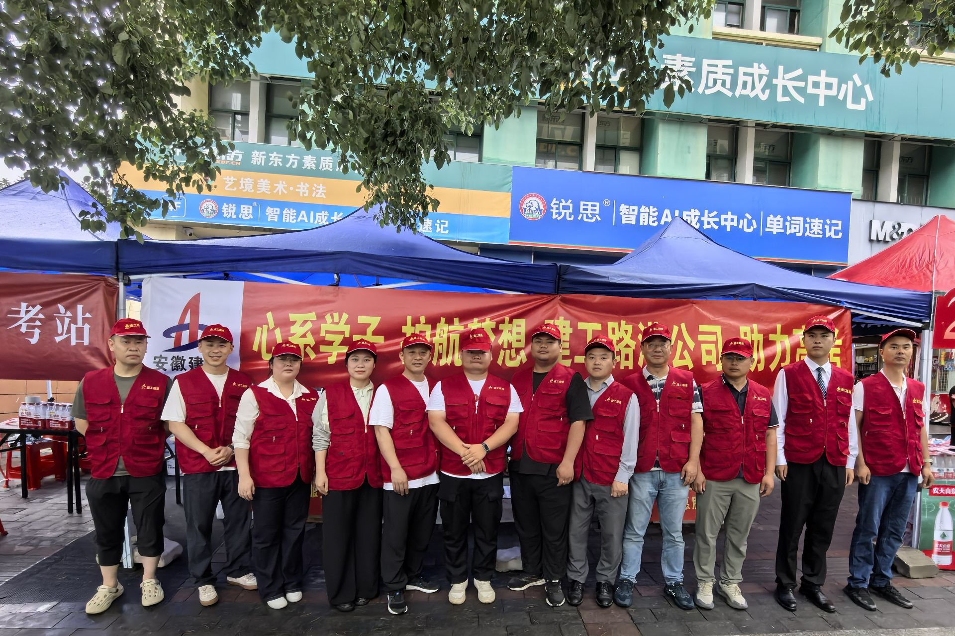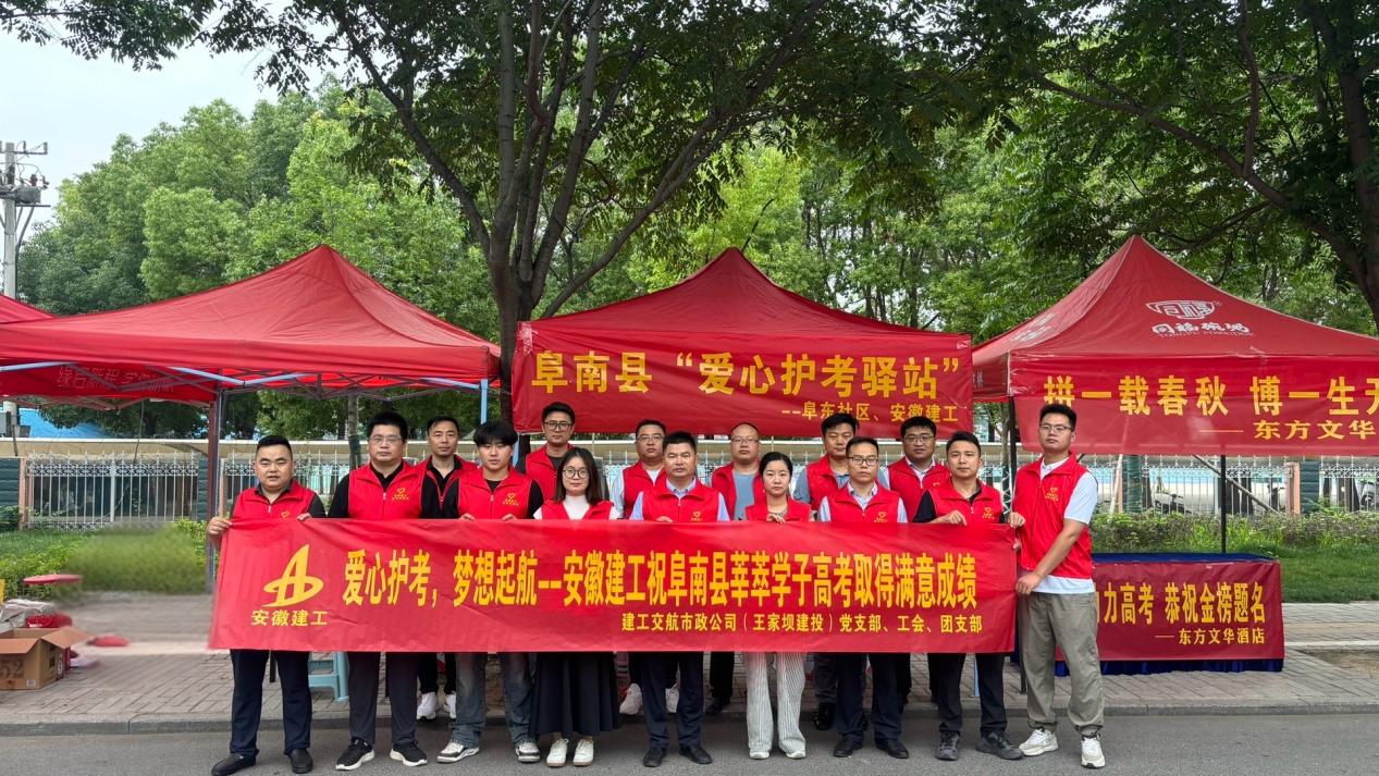 6月7日,建工交航公司市政分公司(王家壩建投)攜手淮河、阜東社區組成高考志愿服務隊,在阜南一初、實驗中學考點支起“愛心助考驛站”。志愿者們提前支起遮陽棚,為考生和家長遞上冰鎮礦泉水、防暑藥品與備用文具,用連續六年的堅守為高考學子護航,讓考場外充滿暖心服務的溫度。