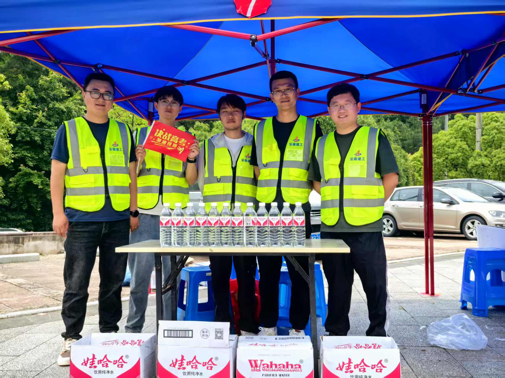 高考首日,在萬千學子奔赴人生重要考場的同時,身著志愿服務紅馬甲的建工投資公司員工們也忙碌在護考、助考第一線。考點外,印有“安徽建工愛心助考服務站”字樣的帳篷成為一道亮麗的風景線。項目志愿者們早早集結,精心布置起這方溫馨的“愛心驛站”,免費為考生和家長提供礦泉水、紙巾、雨傘、扇子等物品。為服務岳西考生,岳西“兩校”項目公司聯合岳西縣委黨校為考生和家長提供交通疏導、指引,同時開放岳西縣委黨校部分區域為考點外等候的家長提供休息區。