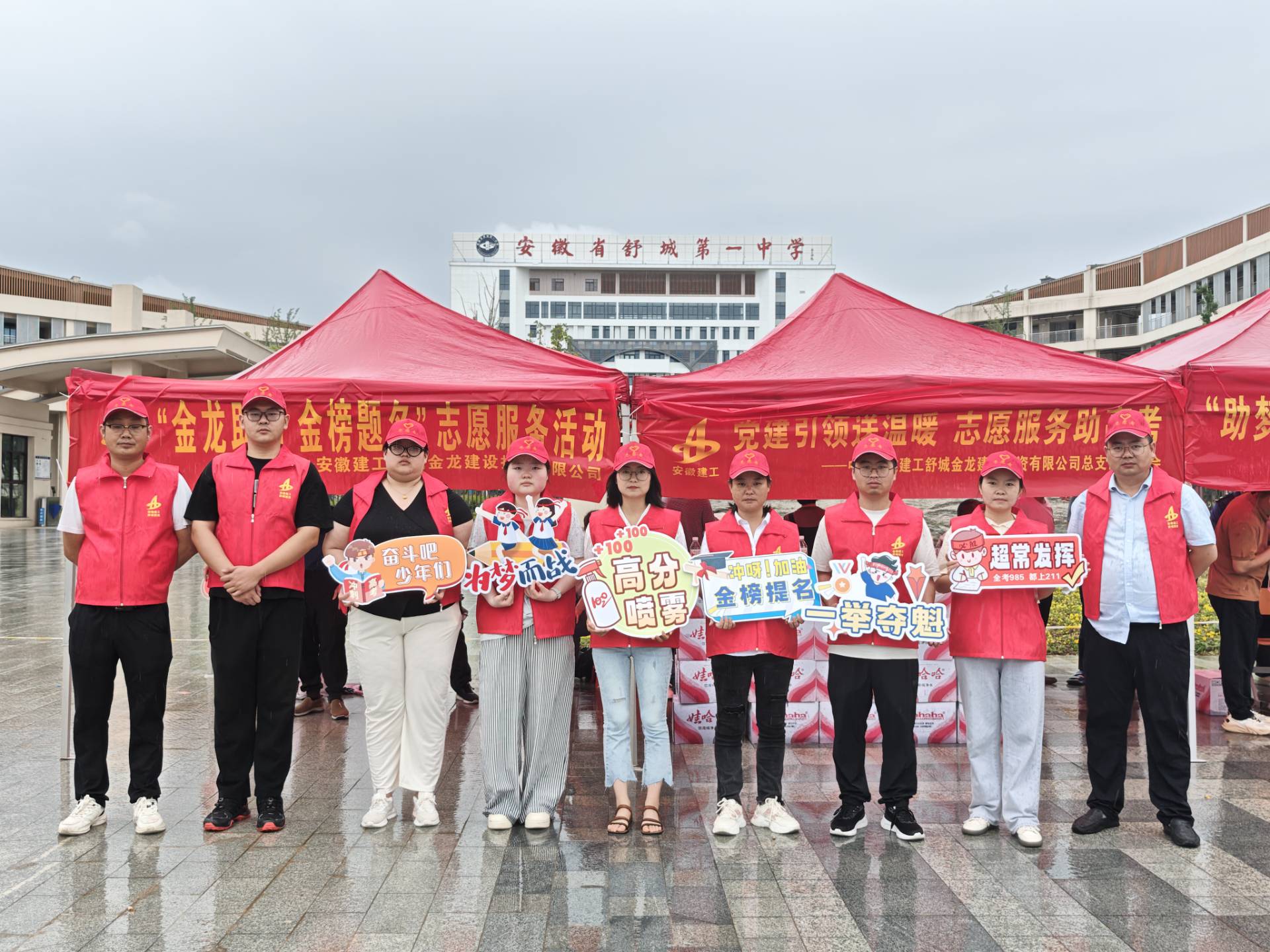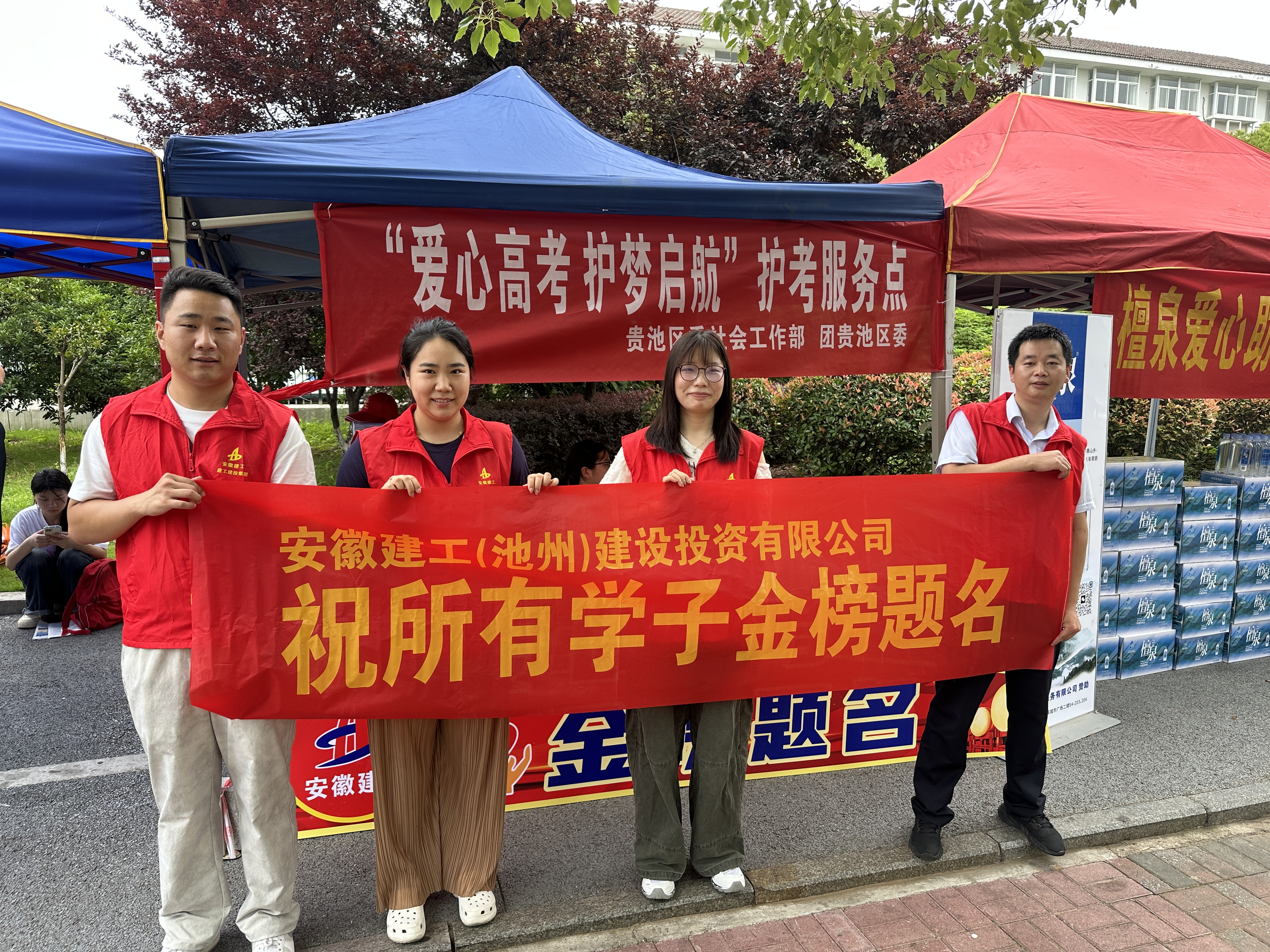 安徽建工池州建投積極響應池州團市委、貴池團區委號召,組織10余名志愿者在池州六中開展愛心助考活動,準備了一次性雨衣、礦泉水以及愛心送考車輛,以備考生和家長需要,為考生保駕護航。