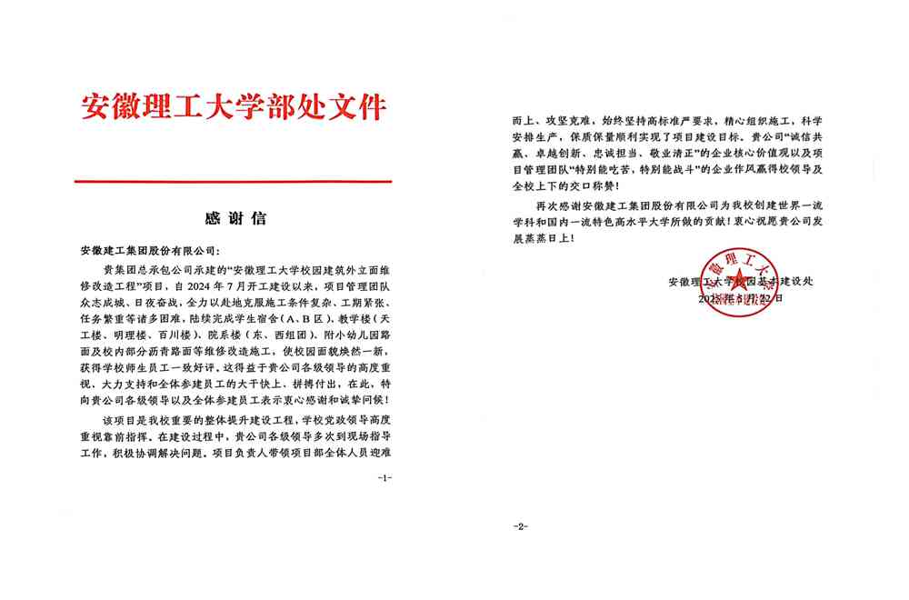 近日,安徽理工大學(xué)給安徽建工集團發(fā)來感謝信。信中對建工總承包公司精心組織施工、科學(xué)安排生產(chǎn)、高標準高質(zhì)量完成安徽理工大學(xué)校園建筑外立面維修改造工程項目給予好評,對安徽建工集團助力其創(chuàng)建世界一流學(xué)科和國內(nèi)一流特色高水平大學(xué)表示感謝。