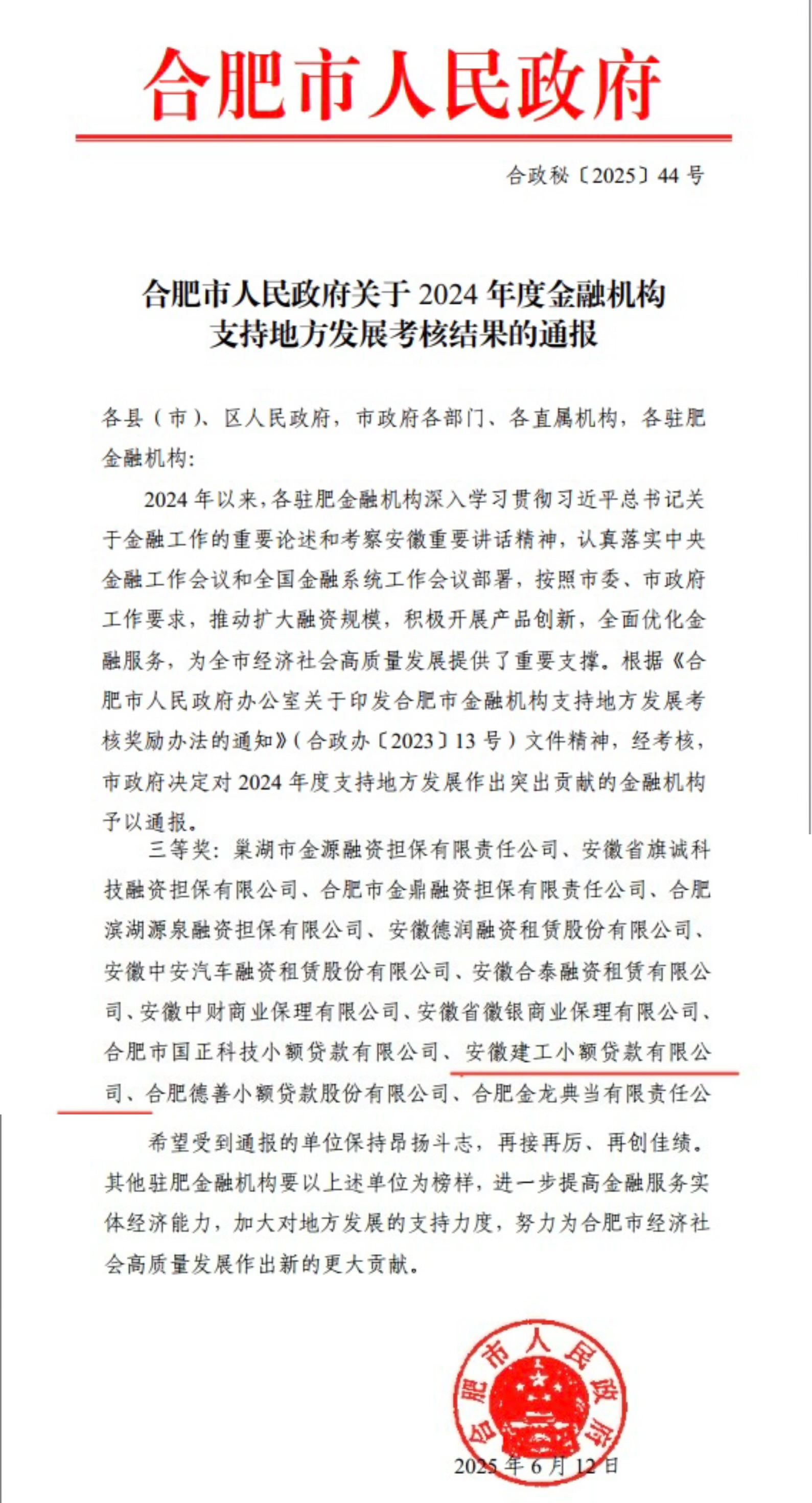 在近日發布的《合肥市人民政府關于2024年度金融機構支持地方發展考核結果的通報》中,安建小貸再次榮膺“地方金融組織”獎項(三等獎)。這已是公司第八次獲此殊榮,充分彰顯了公司在服務地方經濟發展方面的持續貢獻。
