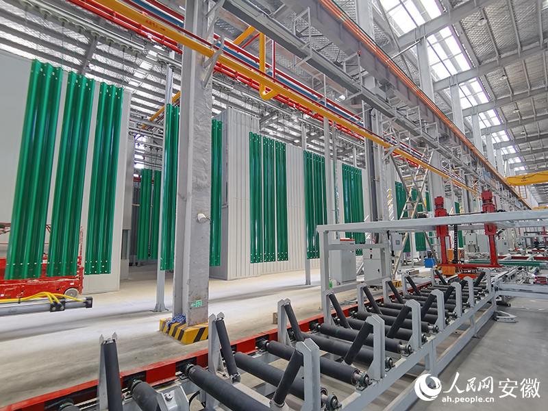 以波形梁護欄為例,該產品生產制作并不復雜,但由于皖北皖中皖南氣候條件不同,對產品防腐工藝要求極高。在產業園一期,已經配備全自動公路波形護欄板冷彎成型生產線、熱鍍鋅生產線及噴粉復合生產線,其中全自動噴粉復合生產線采用積放鏈輸送工藝,集成國內外先進設計理念,實現環氧鋅基與熱鍍鋅噴塑雙防腐工藝兼容,工件從下件到覆膜包裝全程自動化,智能化水平位居全國前列。