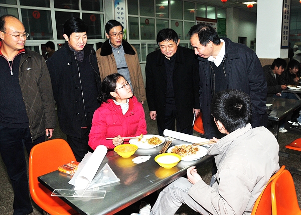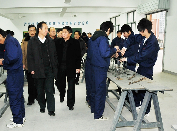 隨后,程廳長一行在校領導的陪同下,實地察看了校園環境、實訓場地和設施,并叮囑學校要重視和確保學生實習安全。程廳長還深入到學生宿舍和學生餐廳視察,并就助學金發放和伙食等問題與學生進行交談。