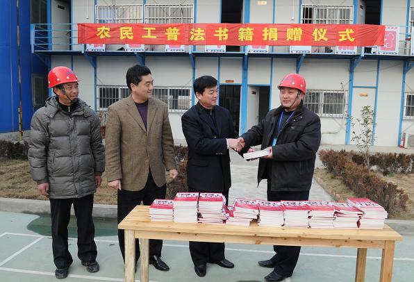 2010年元月28日下午,合肥市人民檢察院向安徽建工農民工業余學校捐贈農民工普法書籍儀式在安徽三建美亞光電項目部舉行。市檢察院黨組成員、副檢察長黃世斌,黨組成員、政治部主任童興芝等一行四人,看望慰問農民工兄弟,宣傳農民工法律維權知識,并現場捐贈《農民工普法讀本》200本。集團公司副總經理、集團農民工業余學校常務副校長王禮義,集團人力資源部主任胡建英,安徽三建紀委書記周湃等出席捐贈儀式。