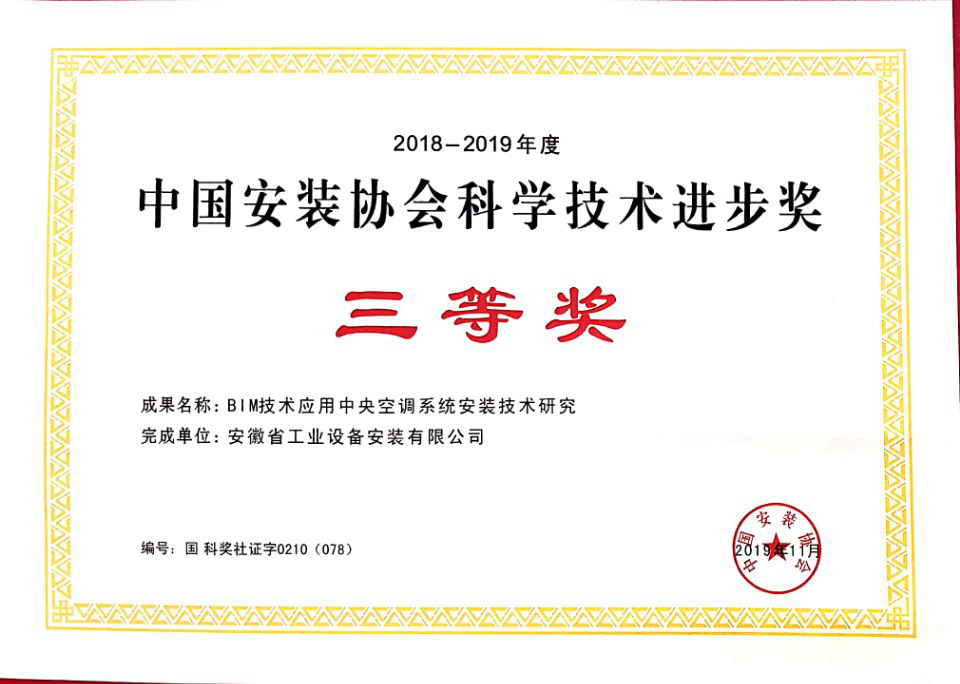 The research subject - Research on BIM (Building Information Modeling) Technology Application for Installation Technology of Central Air-conditioning System, developed independently by ACEG Industrial Equipment Installation Co. Ltd. – one of ACEG`s subsidiary, professionalized contractor for industrial equipment and facility Installation and engineering, won the third-class award of 2018/2019 China Installation Association Science and Technology Progress. The medal and the certificate of the award were issued on August 15, 2020.