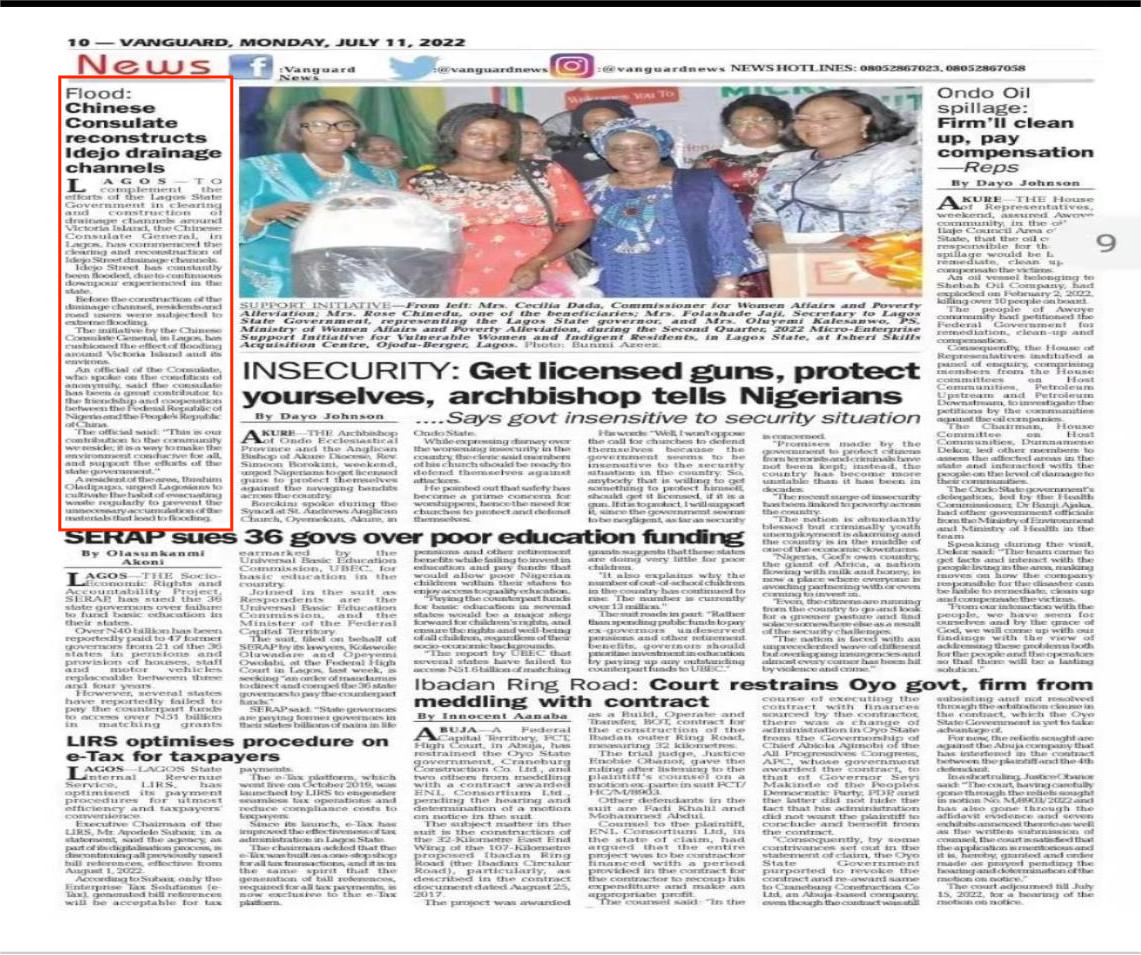 The refurbished Idejo Street drainage channels have also been in the spotlight of many mainstream media outlets in Nigeria, which have offered their appreciations to the Chinese Consulate-General and ACEG for the efforts.