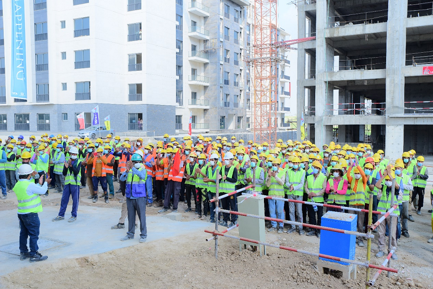 Committed to finishing the main structures of the project on schedule, all staff of the project have taken the epidemic prevention and control and the production safety as their two key tasks since the project commenced on September 1, 2021. They have overcome difficulties such as the hot weather and rainy season, and on the premise of ensuring safe production without accident, achieved a construction progress efficiency record – completing the structures of two and a half floors in one month for the office building and two floors in one month for the apartment building, and the predetermined goals were successfully achieved.
